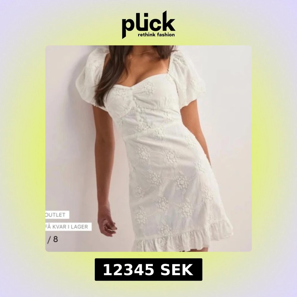 Supersöt vit kort klänning med puffärmar och broderade blommor. Klänningen har en v-ringad urringning, volangkant nedtill och är tillverkad i bomull. Köpt för 599kr, inga defekter endast använd efteråt på studentskivan ej utspring!