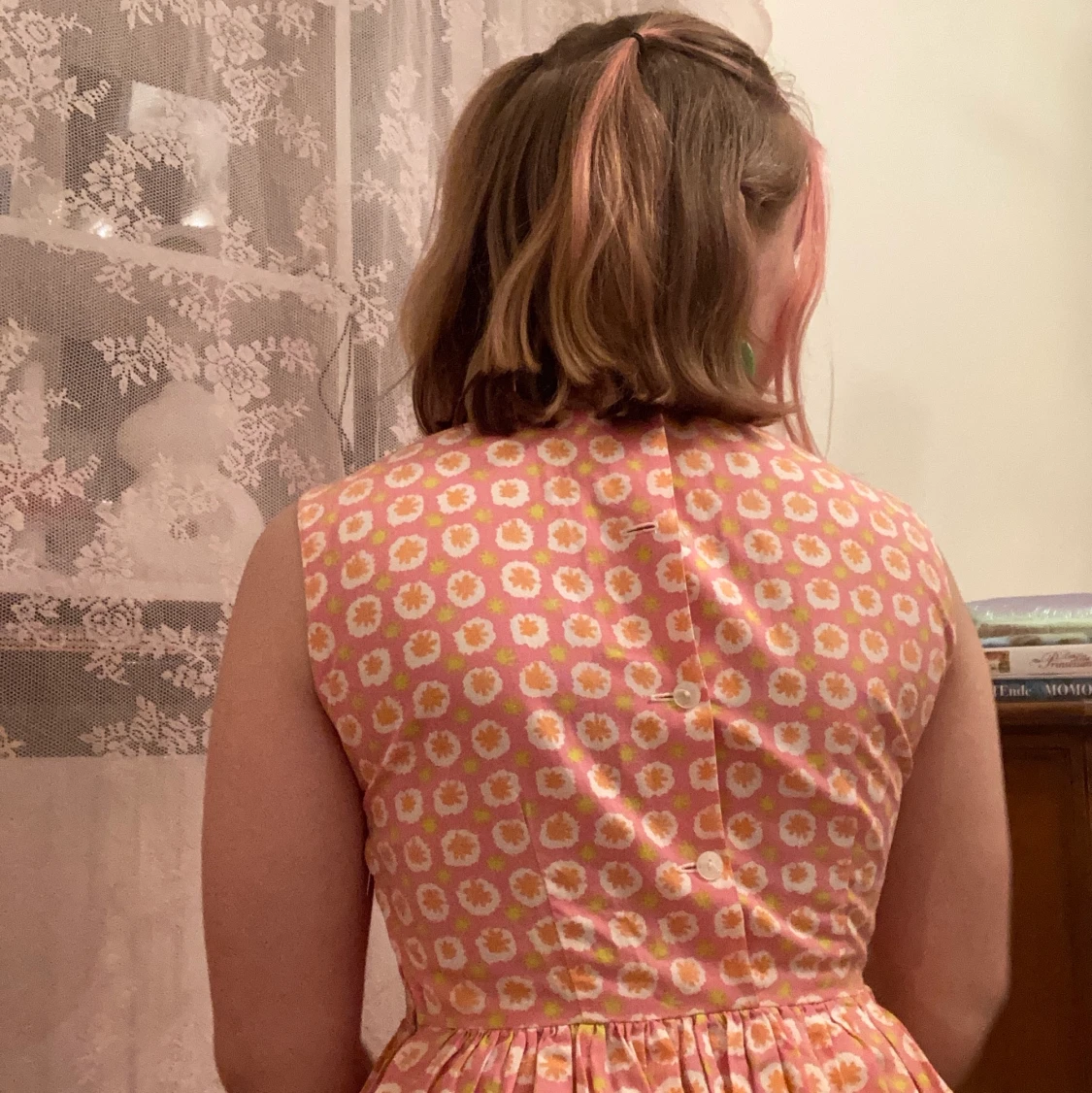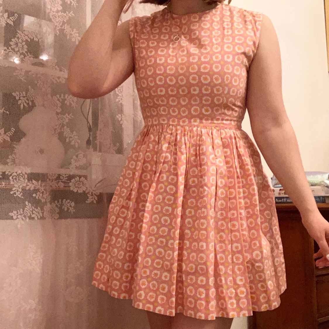 Retro klänning, rosa med orangea och gröngula blommor. Färgerna syns bäst på första bilden. Klänningen har en dragkedja i sidan och knappar på baksidan. (Andra knappen finns men jag kunde inte knäppa den själv xD.) OBS! Blusen ingår inte! Jag på bilderna är 150cm lång och bär vanligtvis stl.XS