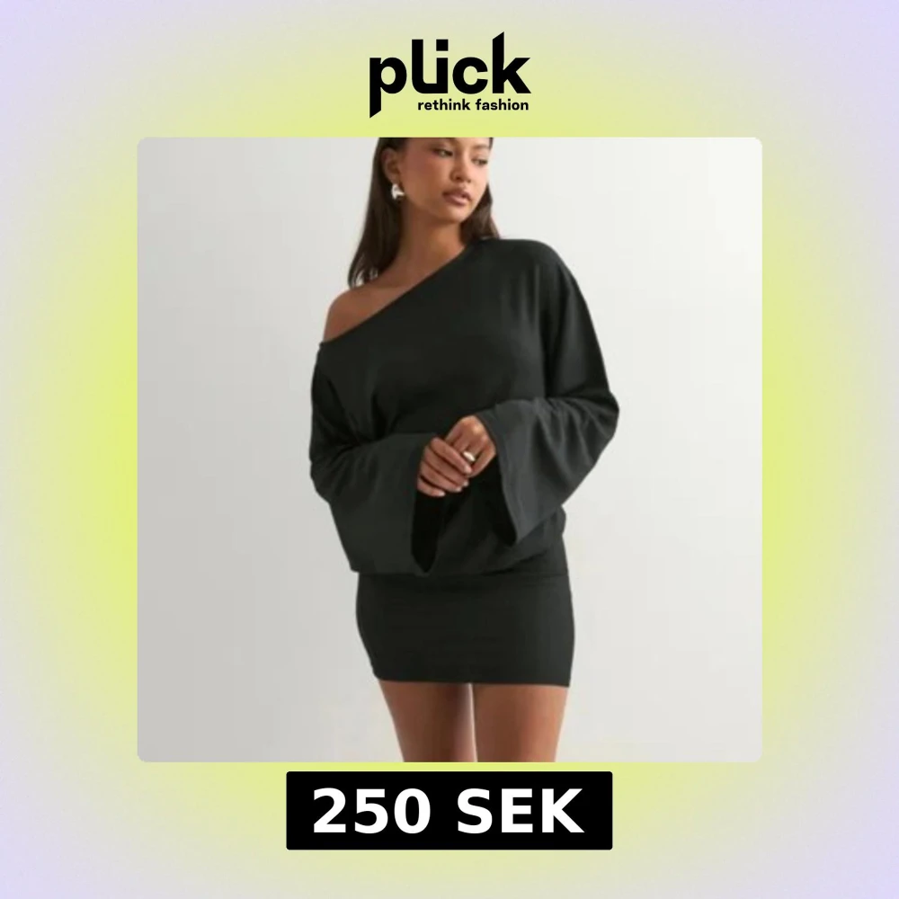 Svart kortklänning från Nelly med offshoulder-design och vida ärmar. Köpte för ett tag sen men aldrig kommit till användning, lappar kvar💗