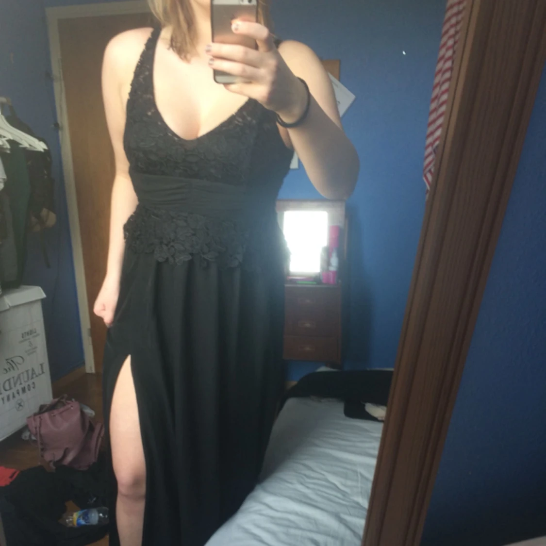 Superfin långklänning med spets och slits i ena benet. Använd en gång och är i nyskick. Har pads för brösten och är väldigt bekväm.