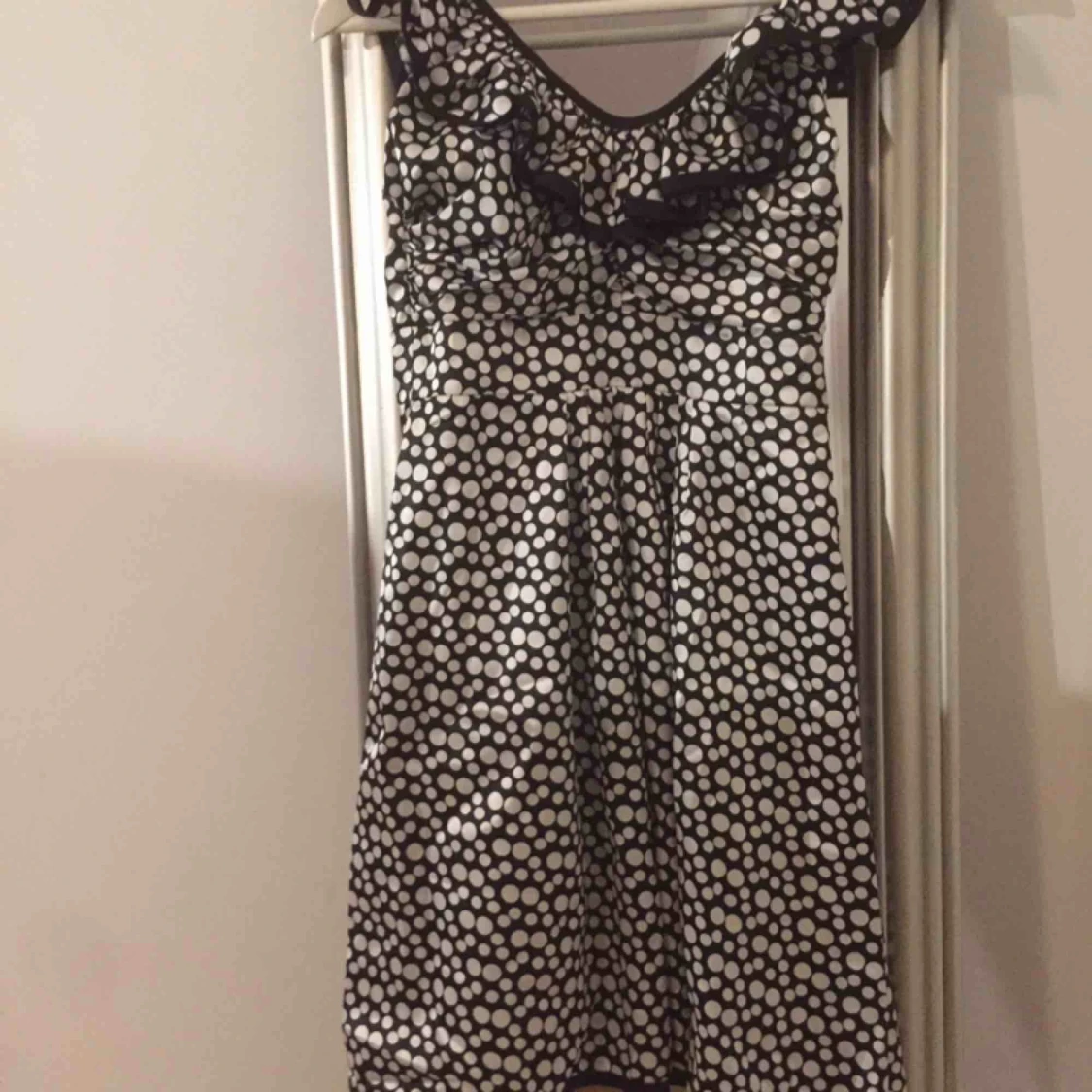 Otroligt snygg klänning med en volang upptill vid bysten som sträcker sig bak i rygg, där man även knyter på sig klänningen. Glansigt, glatt tyg, svartvitprickig. Passar xs med normal/stor byst alt s med liten/normal byst Aldrig använd (för lliten)