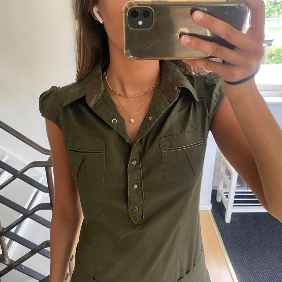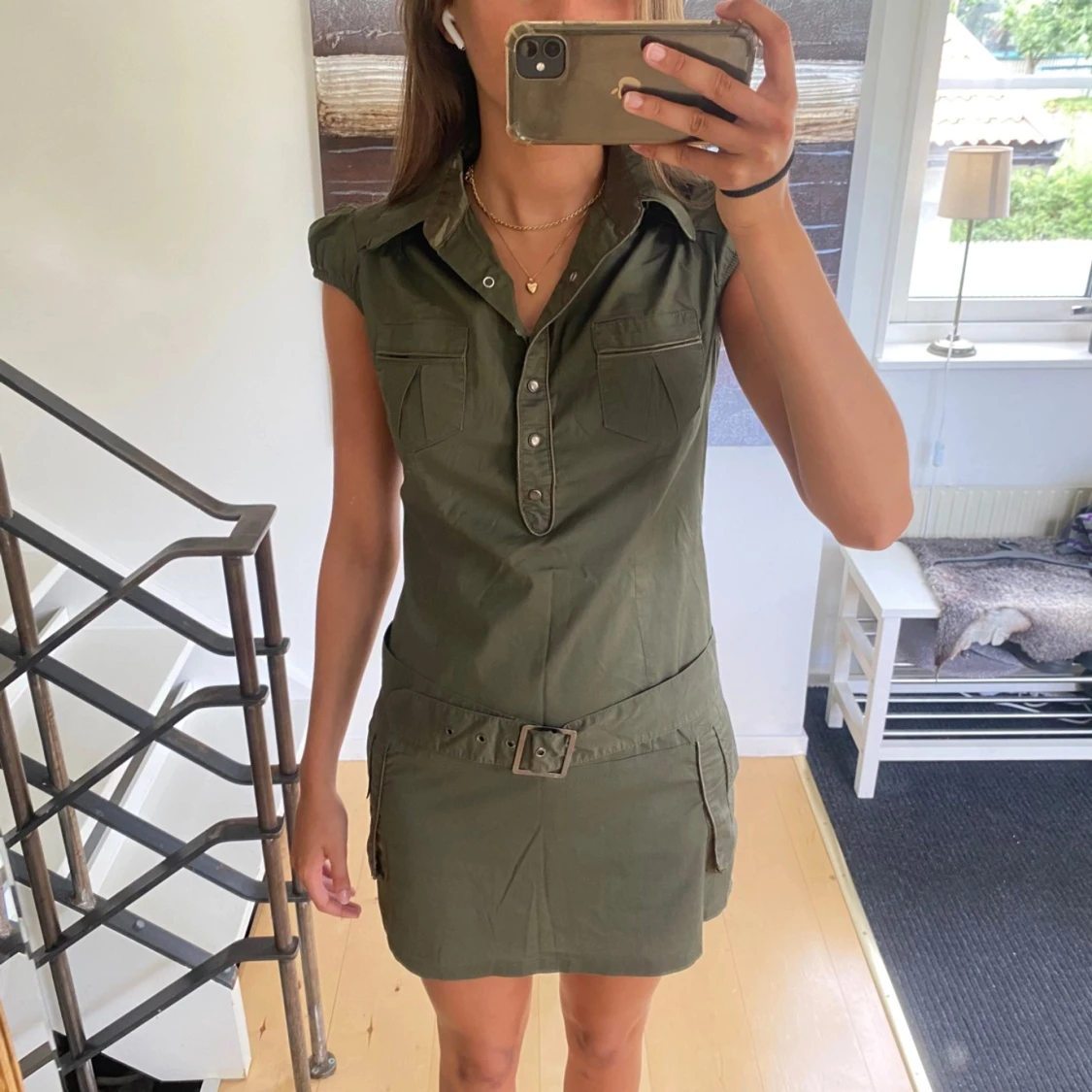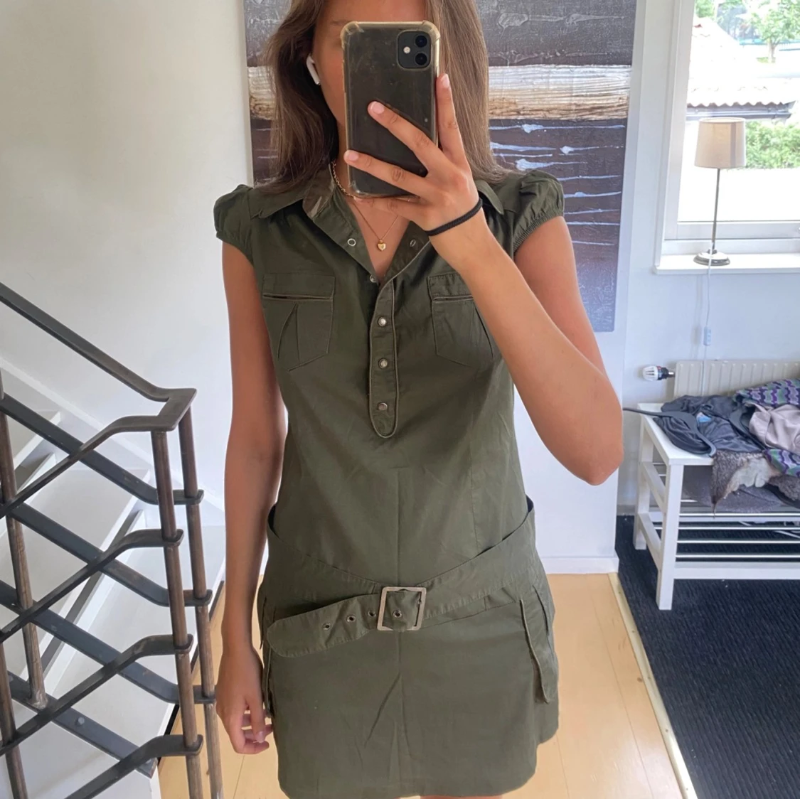 Grön jeansklänning med coola detaljer. Knappar vid bröstet som gör att man kan justera urringningen. Skärpet går även att ta bort ifall det önskas, fickor på sidan av klänningen. 😊storlek S