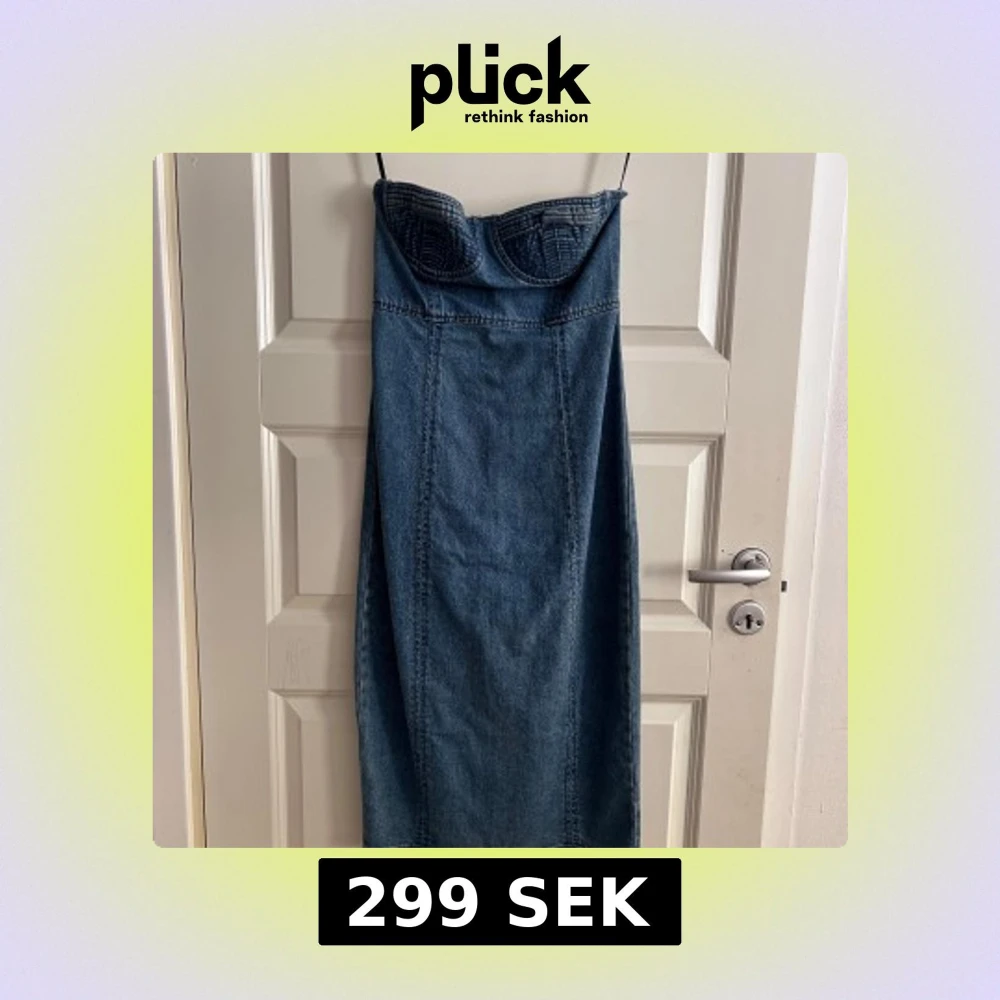 Snygg axelbandslös jeansklänning från Forever 21. Klänningen har en tight passform med en slits baktill och dragkedja för enkel påklädning. Perfekt för en trendig look!