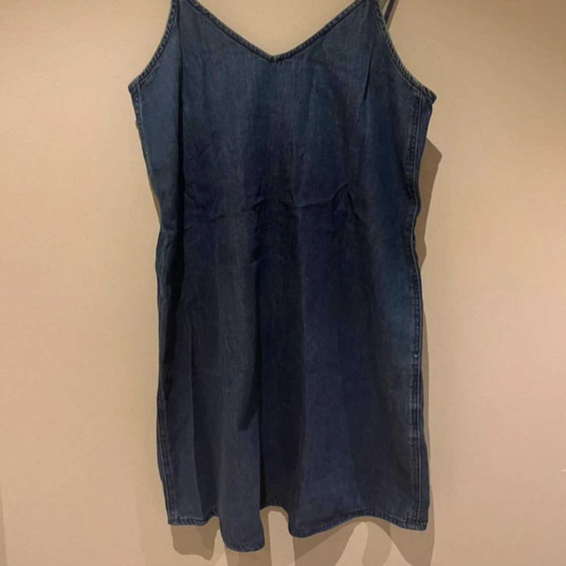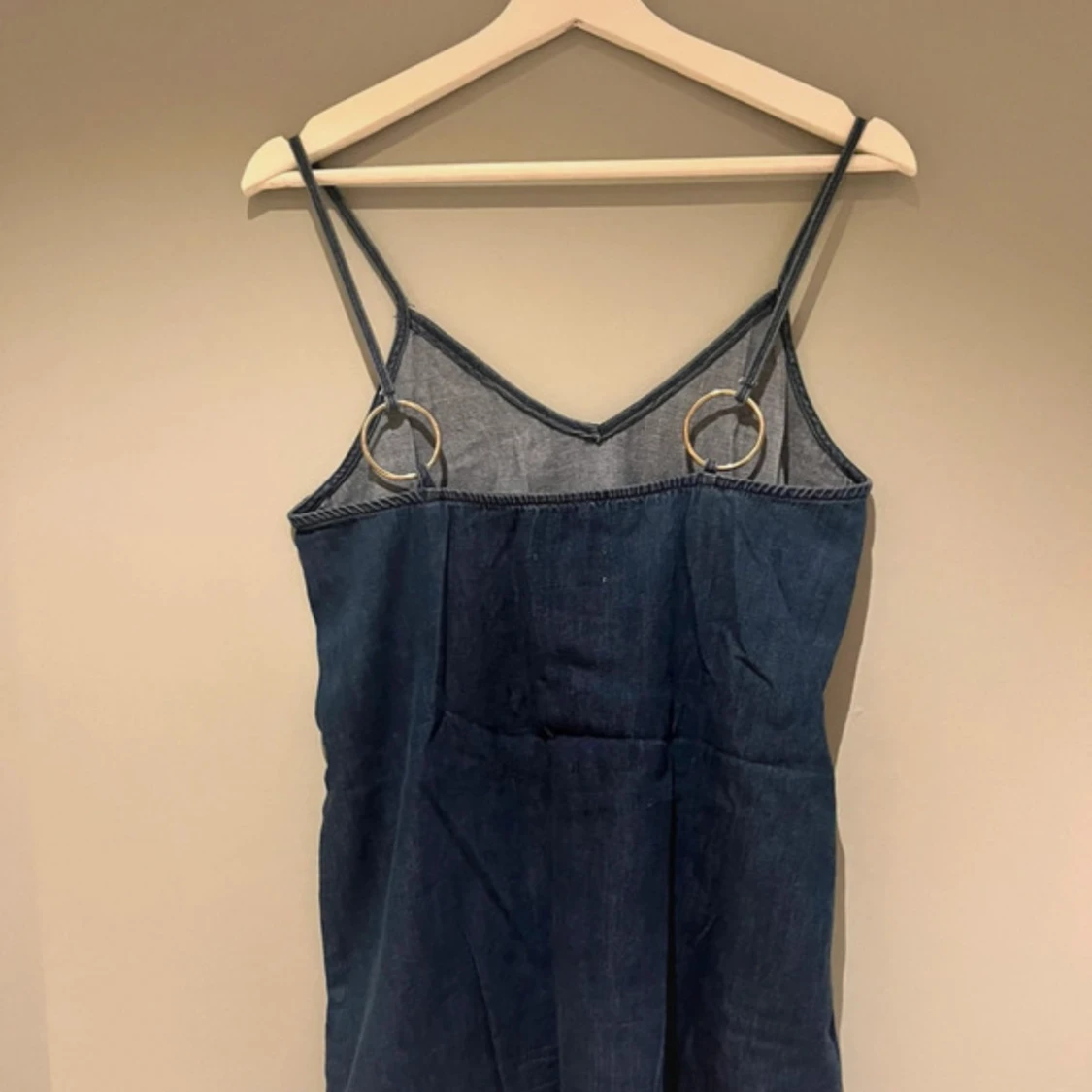 Snygg jeansklänning i mörkblå denim med smala axelband och v-ringning. Klänningen har metallringar bak som cool detalj och är ärmlös med en rak, något lös passform. Perfekt för en avslappnad och trendig look.