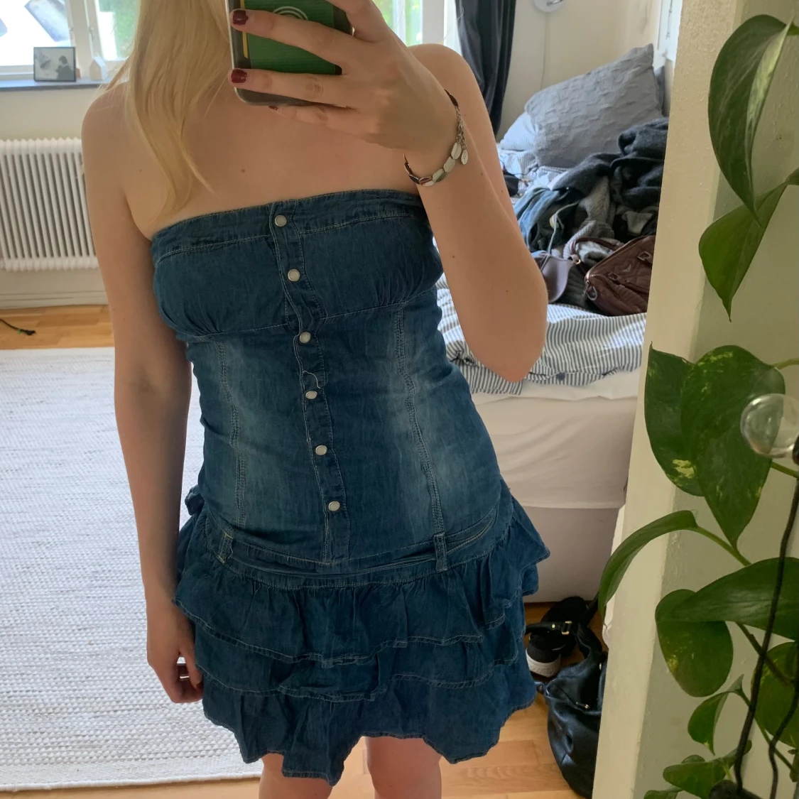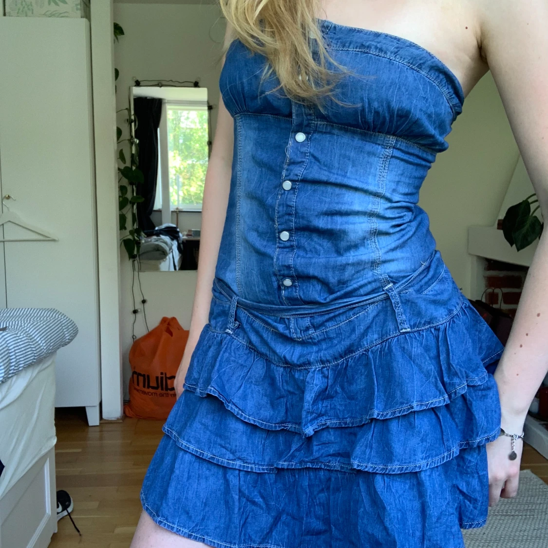 Så söt jeansklänning med volang som tyvärr är lite för stor för mig! Storlek L men skulle säga att den passar en S eller M💗💗I superbra skick, men översta knappen är lite dålig, men funkar fortfarande💗
