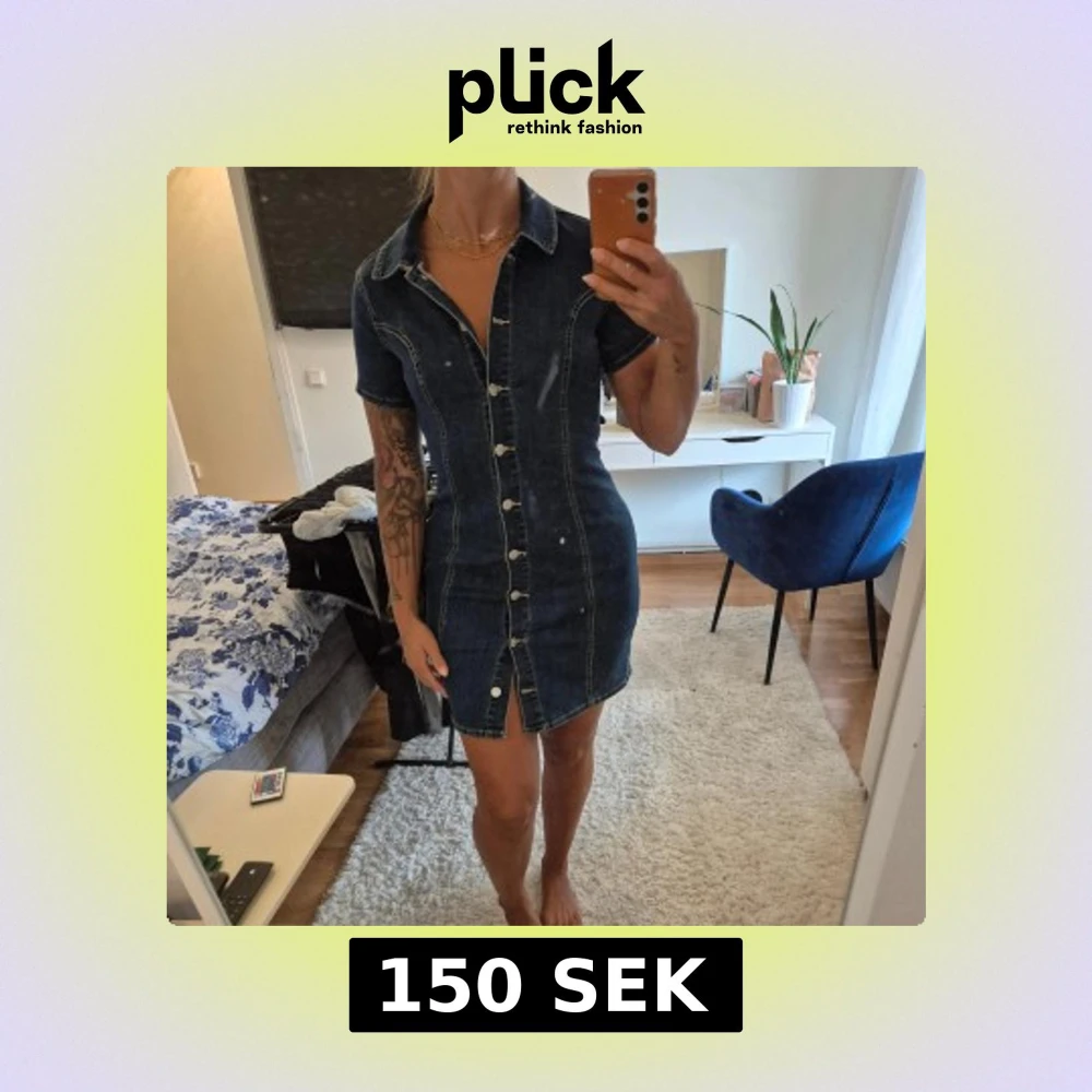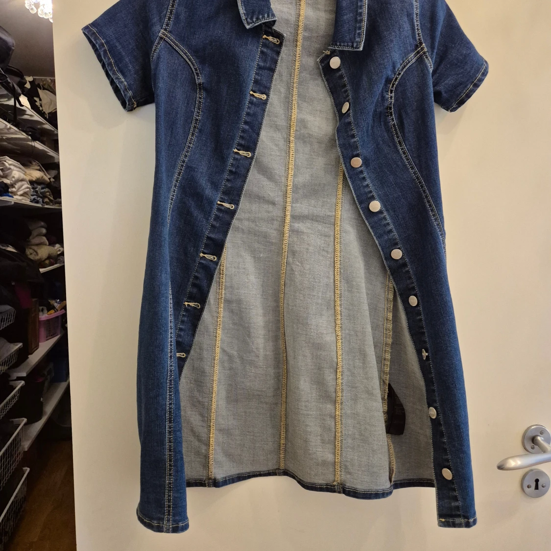 Jeansklänning från 77thFLEA i storlek 34 men passar även mig som är en 36. Stretchigt material. Knappar framtill, korta ärmar och krage. 75% bomull 23% polyester 2% elastan. Använd vid två tillfällen, jättefint skick.