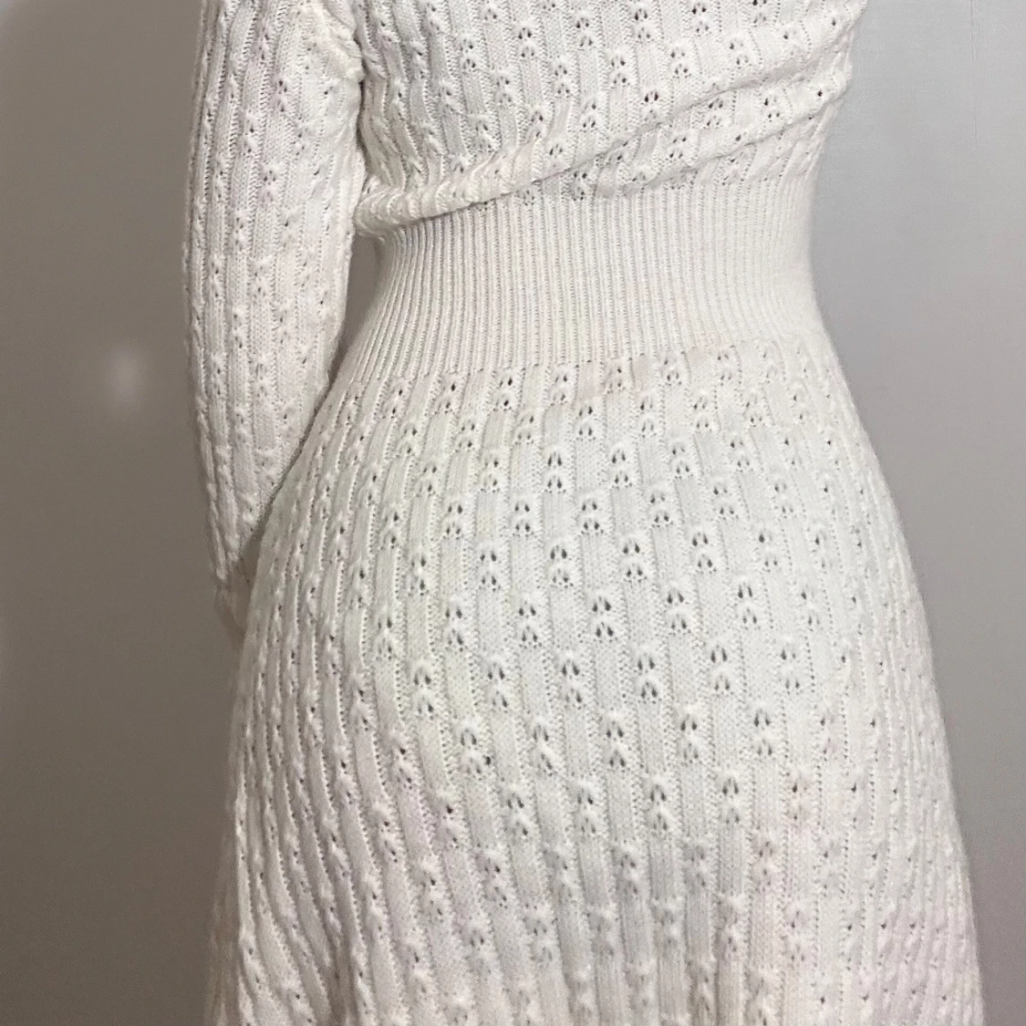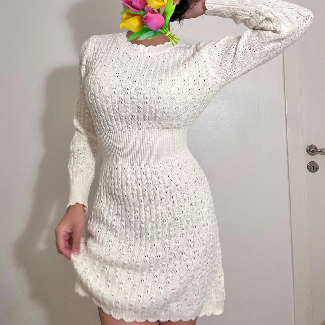 En superfin kräm vit stickad klänning med ribbad midja och långärmad design.