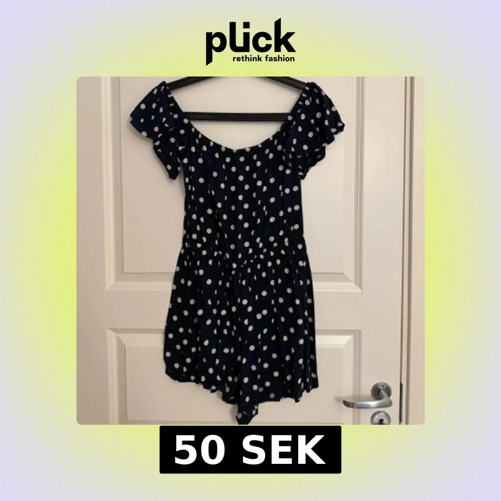 Supersöt jumpsuit från H&M Divided i marinblått med vita prickar. Klänningen har offshoulder-ärmar med volang och resår i midjan för en skön passform. Perfekt för sommarens alla tillfällen!