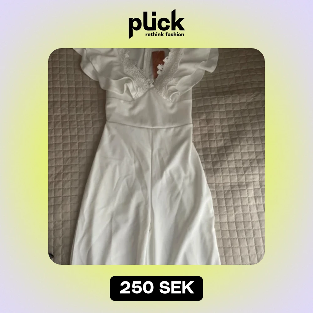 Vit jumpsuit med spetsdetaljer vid halsringningen. Jumpsuiten har en V-ringning och en dragkedja i ryggen. Den är ny och oanvänt. Priset kan diskuteras<3