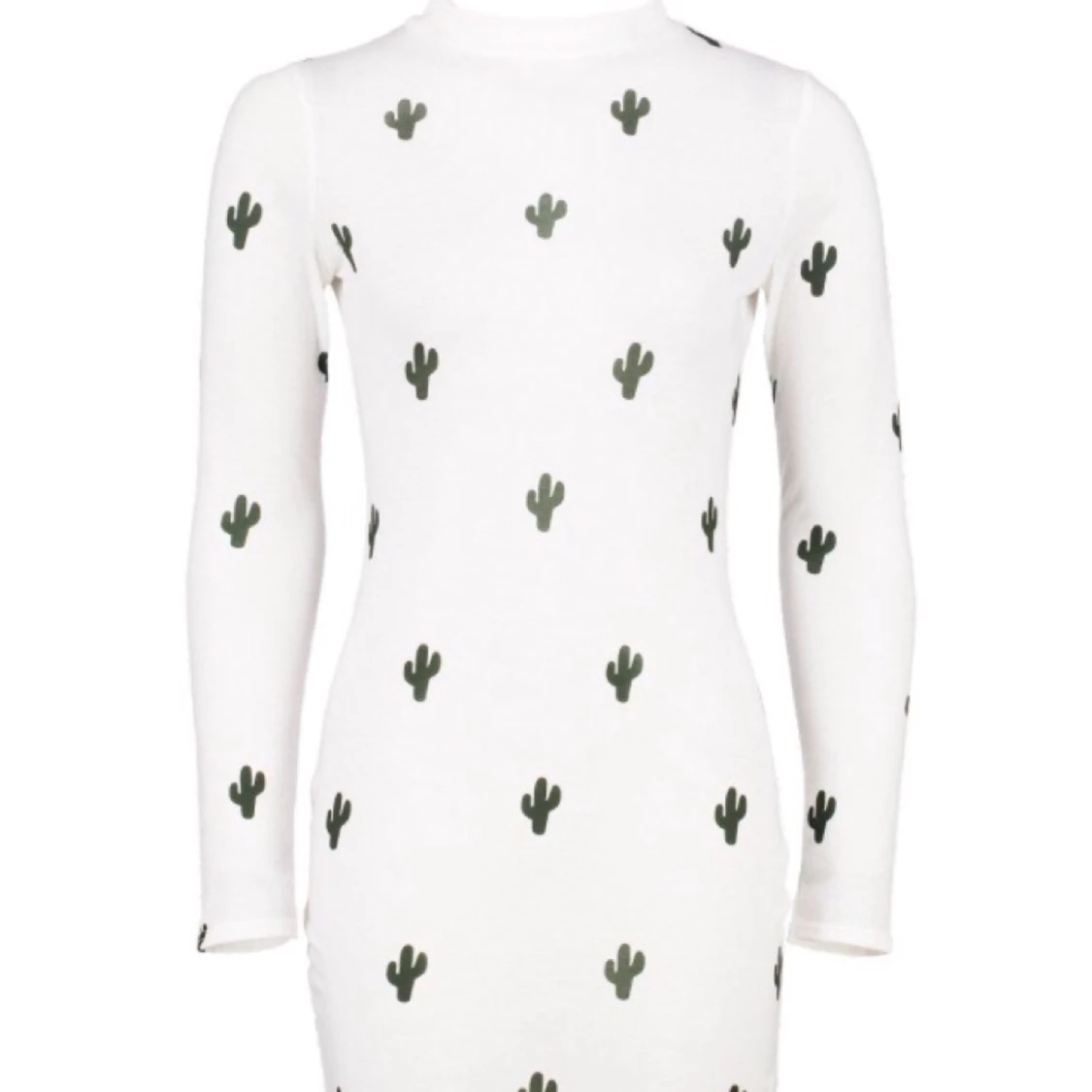 Sjukt snygg klänning i tunt material med kaktustryck på samt liten turtleneck. Köptes på nätet och var dessvärre för liten och därför aldrig använd och hann inte heller skicka tillbaka den i tid.