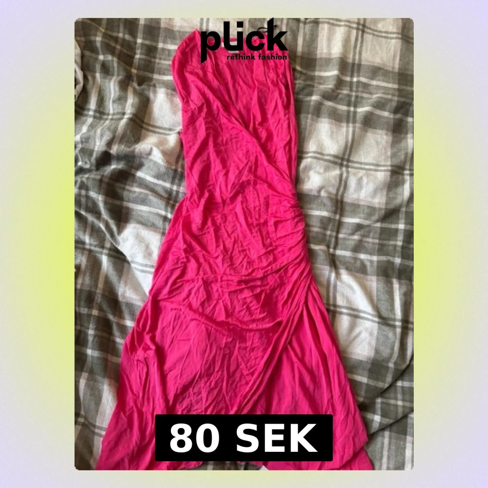 Säljer en lång rosa klänning från H&M i storlek S. Klänningen har v-ringad hals och är ärmlös, med ett snyggt omlottfall och lätt rynkade detaljer längs sidorna. Materialet är mjukt, töjjigt och känns som bomull, perfekt för varma dagar.