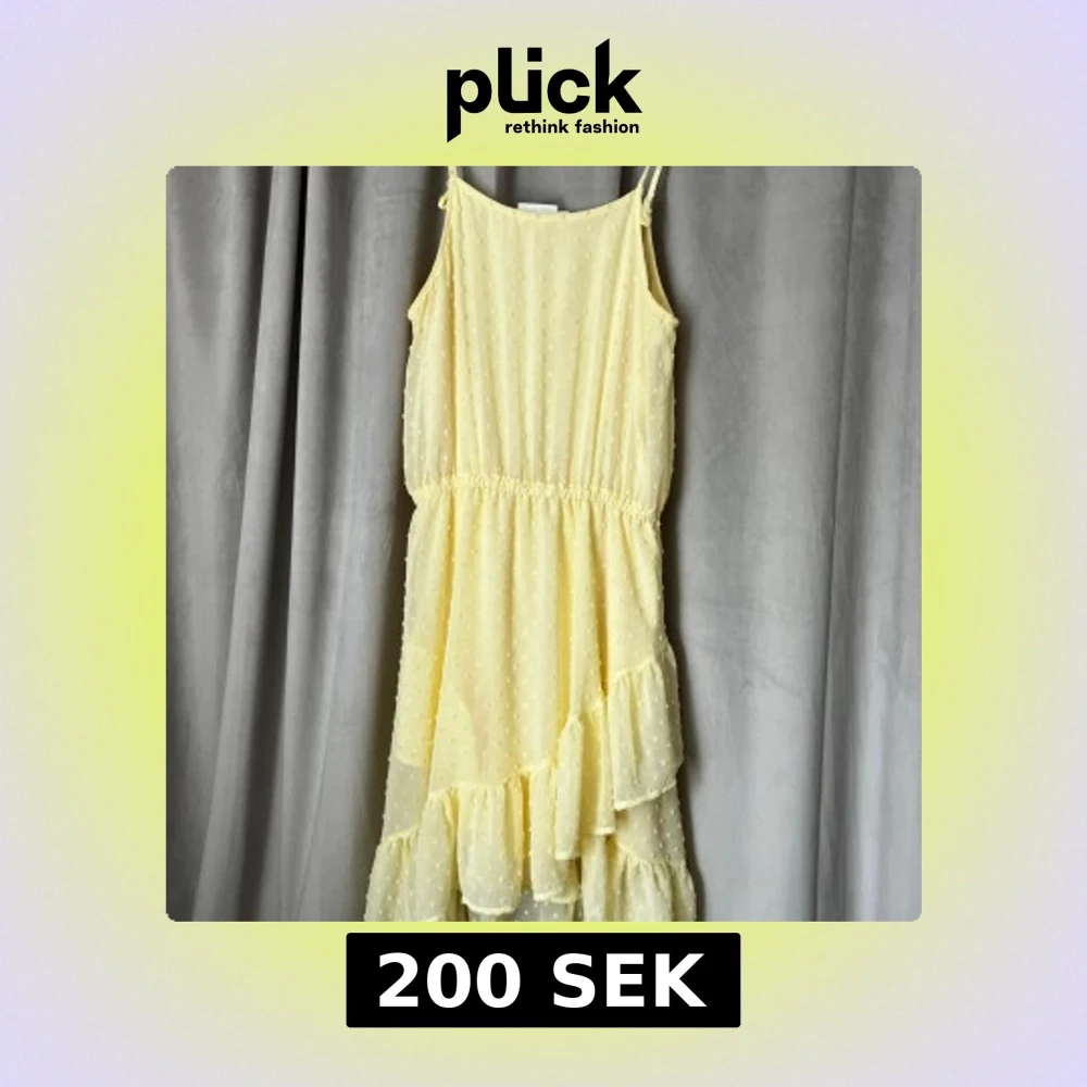 Superfin ljusgul klänning från KappAhl med tunna axelband och volanger nedtill. Prickigt mönster i tyget och elastisk midja för skön passform. Perfekt för sommarens alla tillfällen, lätt och luftig med härlig flow.