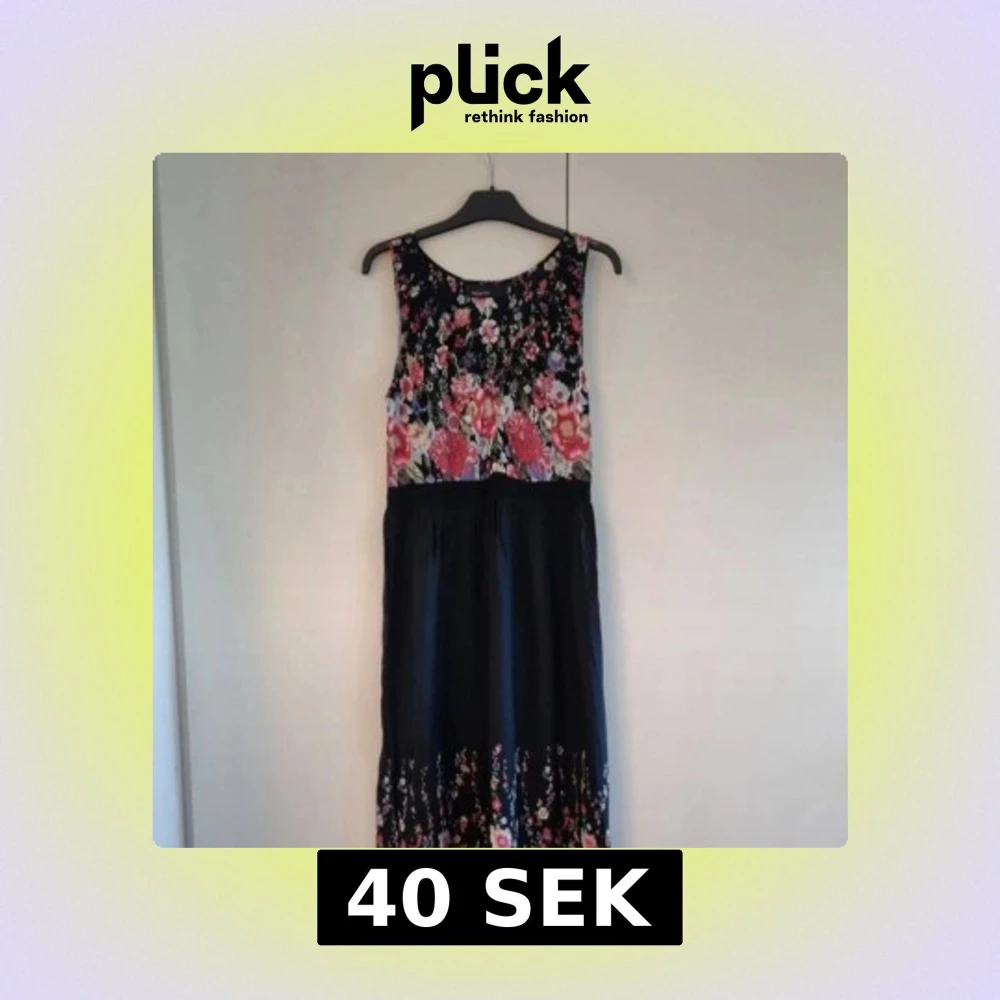 En lång klänning i svart med blommor, sparsamt använd. Storlek på lappen 40 men jag tycker den är mer som en 38. Klänningen har resår i midjan under bröstet och även ett resår i v-ringningen samt en liten dragkedja i sidan. Längd cirka 127 cm lång. INFO: Hund finns i hemmet.