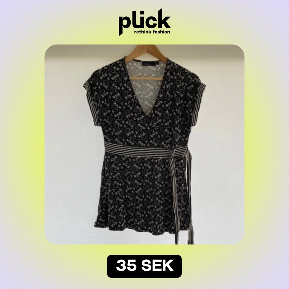 En svart tunika från KappAhl. Tunikan har korta ärmar och ett knytband i midjan med svartvita ränder. Använd 1 gång. Storlek: M. Hör av er vid eventuella frågor!!