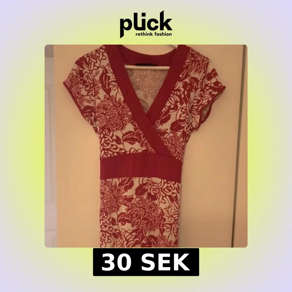 Supersöt kortklänning med rödvitt blommönster och omlott-v-ringning. Klänningen har bred midja med knytband bak och korta ärmar. Perfekt för dig som gillar färg och mönster! Materialet känns mjukt och följsamt.