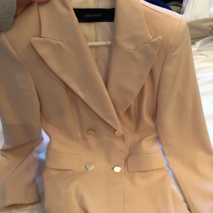 Ljusrosa figursydd kavaj-klänning från Zara med guld detaljer, jättesnygg och använd 1 gång på ett vernissage. Går över knäna och inte för kort, skitsnygg med vanliga pumps eller stövlar. Kan användas som vanlig kavaj/ jacka också. Storlek XS men passar Också S Inklusive frakt!