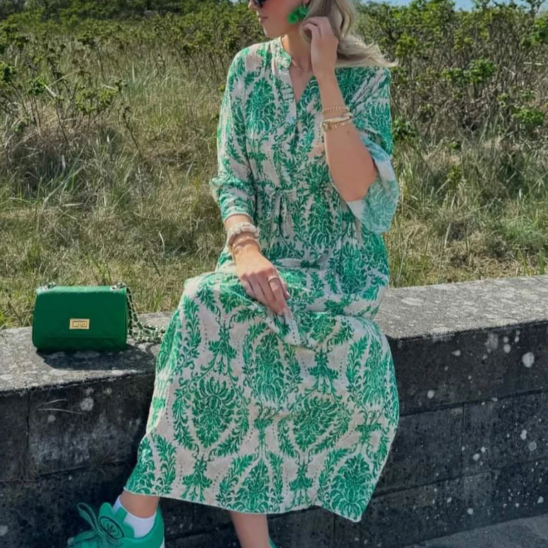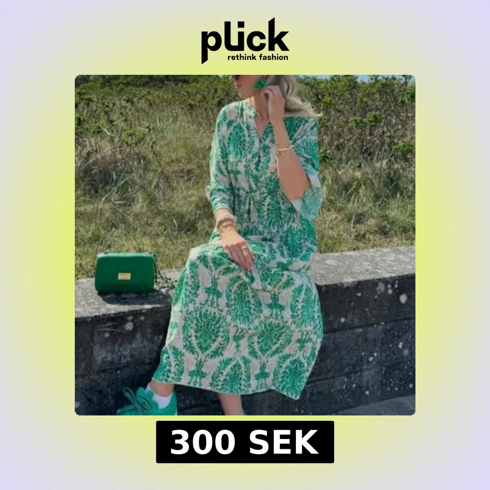 Snygg långklänning i vitt och grönt med unikt mönster. Klänningen har trekvartsärm och v-ringning, perfekt för sommarens varma dagar. Lätt och luftig passform som ger en avslappnad men trendig look. Omlott från hm