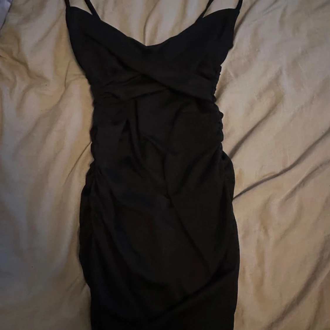 Snygg svart kortklänning med omlott-detalj och smala axelband. Scrunch i rumpan. Helt oanvänd.