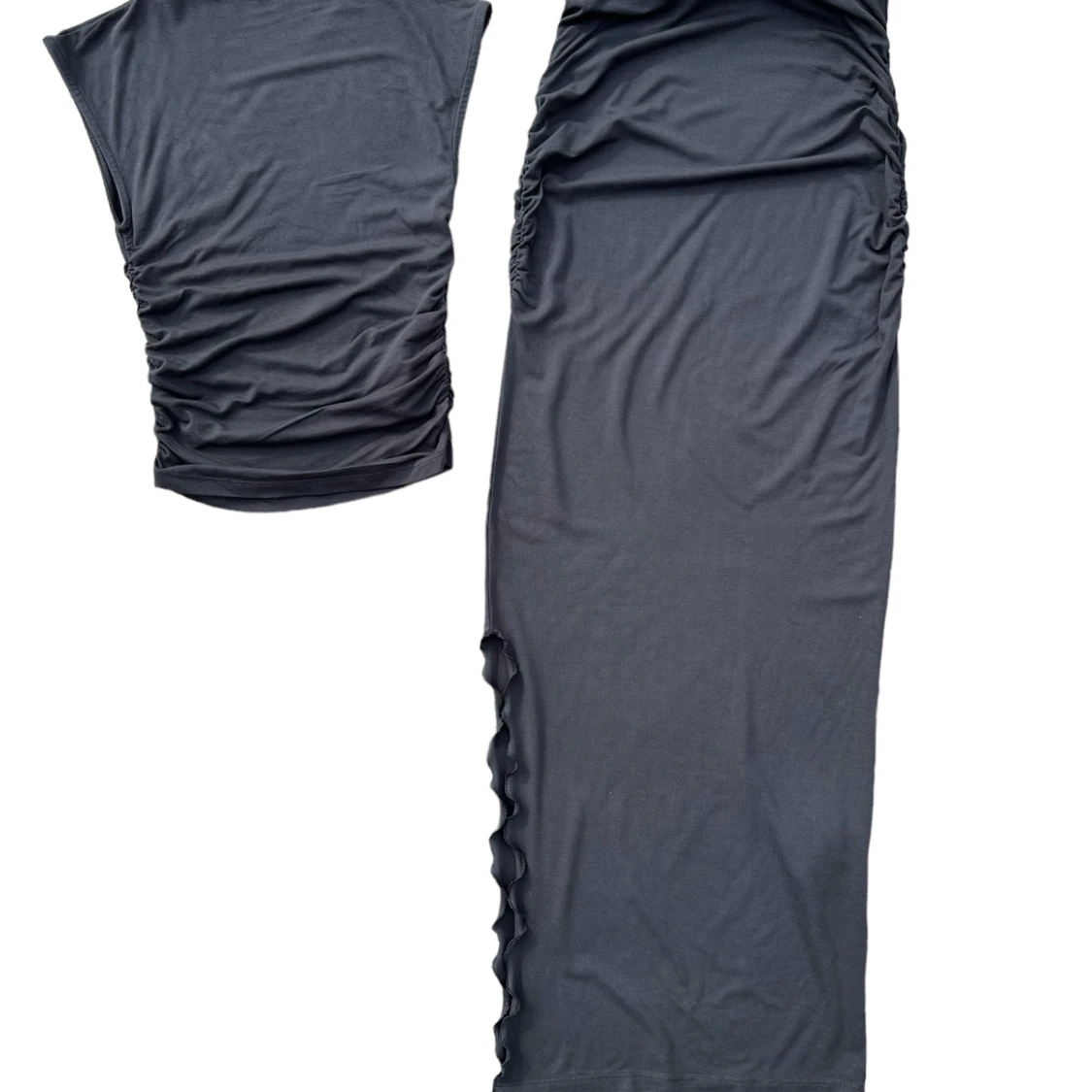 Ljuvlig långkjol med draperingar, samt matchande top i samma grå. Solen är omsydd med ett sprund till knäet för att kunna gå 😊Sparsamt använt, toppskick. Skriv om du har frågor 🩶