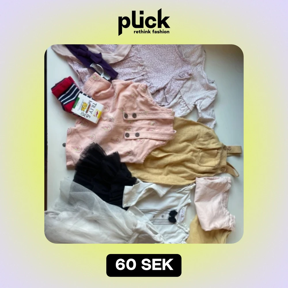 2 t-shirts (en body) 2 hängselbyxor (en kort & en tunnare virkad) 4 klänningar varav en är som en body Strumpor, en dregglis och hårband. Skicket är blandat, obehandlade fläckar KAN finnas men generellt sett fint skick