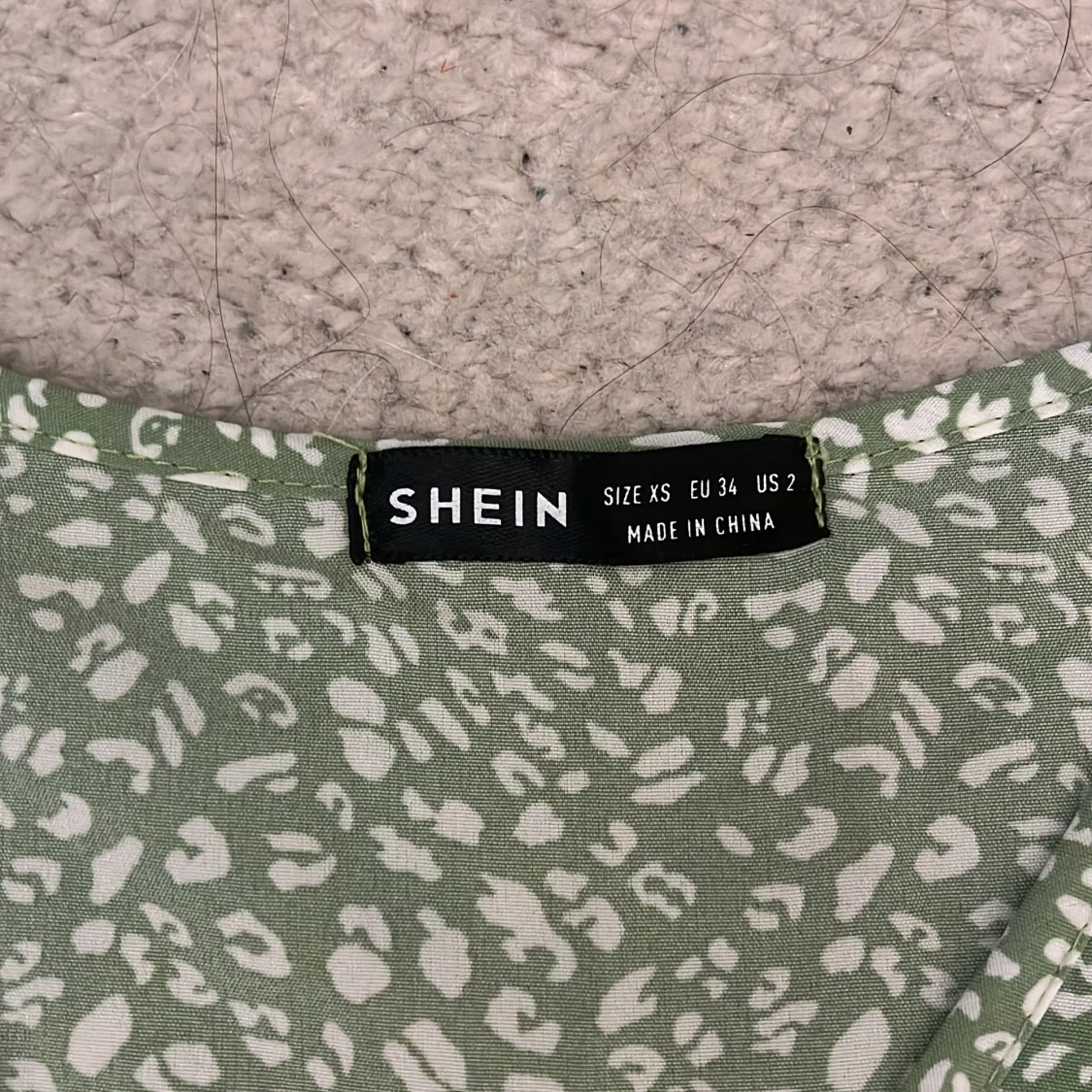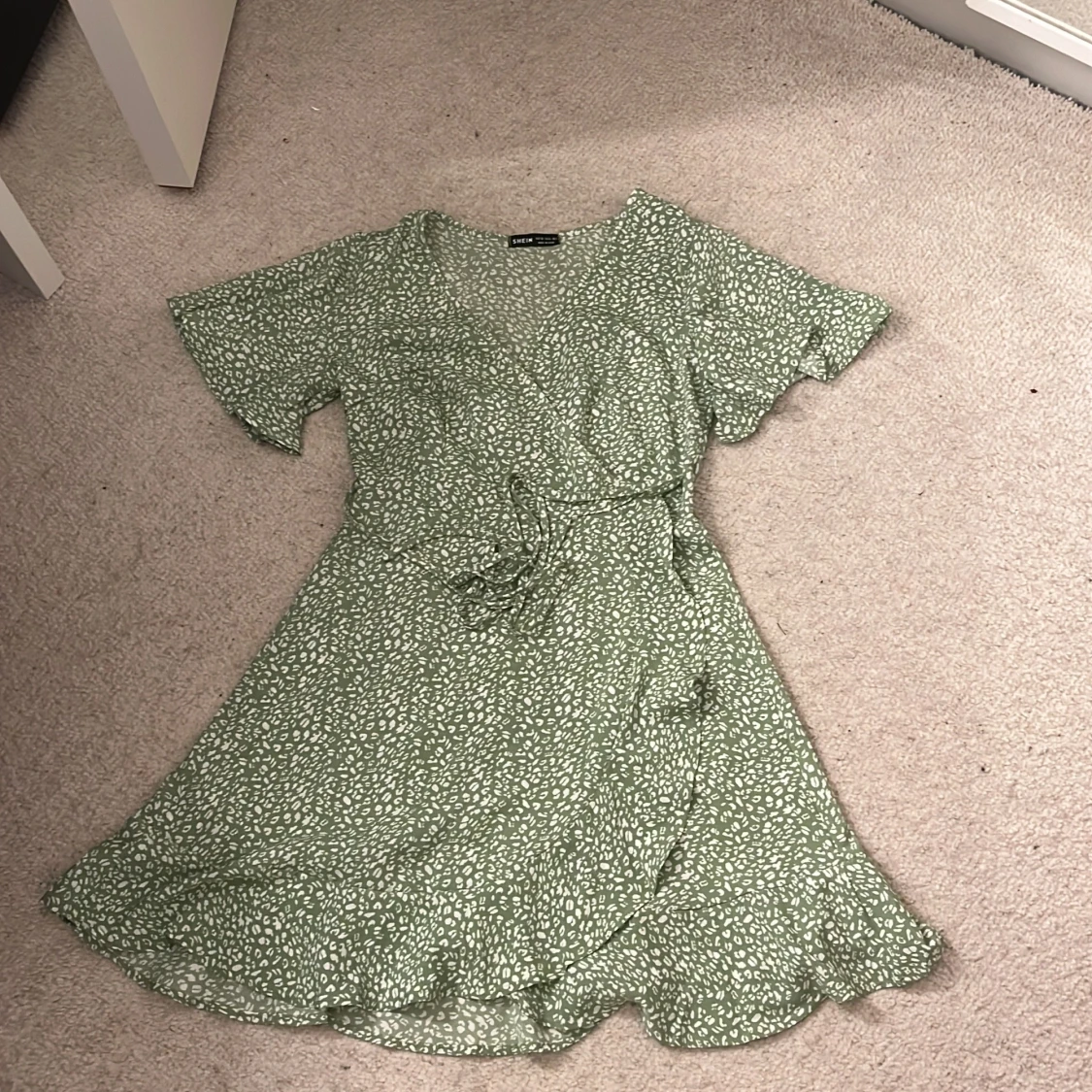 Säljer en söt grön kortklänning från Shein med ett vitt mönster. Klänningen har korta ärmar och en omlott-design med knytning i midjan. Perfekt för en somrig look! 🌿