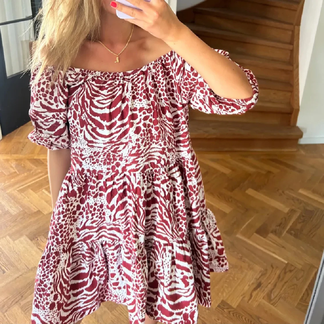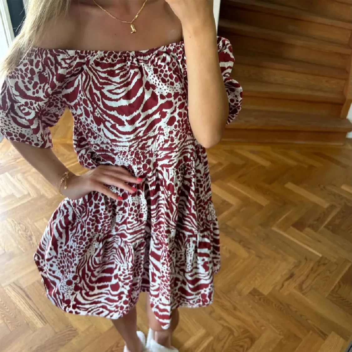 Rödvit offshoulder klänning med mönster