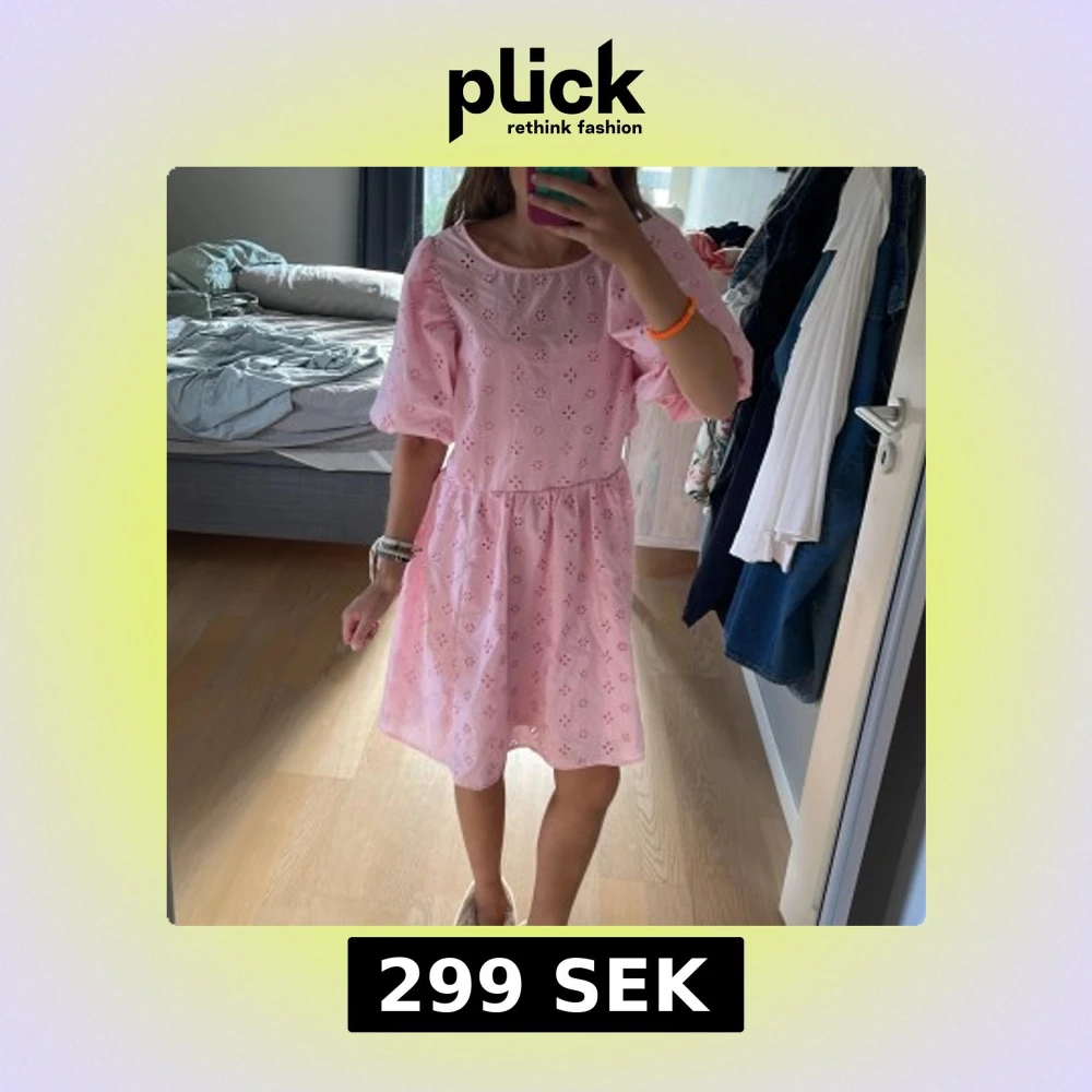 Superfin rosa kortklänning med broderade blommor, puffiga kortärmar och öppen rygg med knyt. Klänningen har en luftig passform och är perfekt för varma dagar. Materialet känns lätt och somrigt, och den har en söt volangkant nedtill.