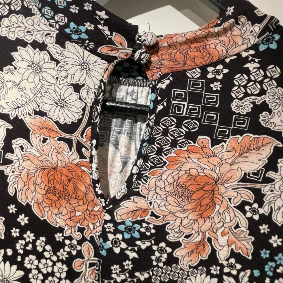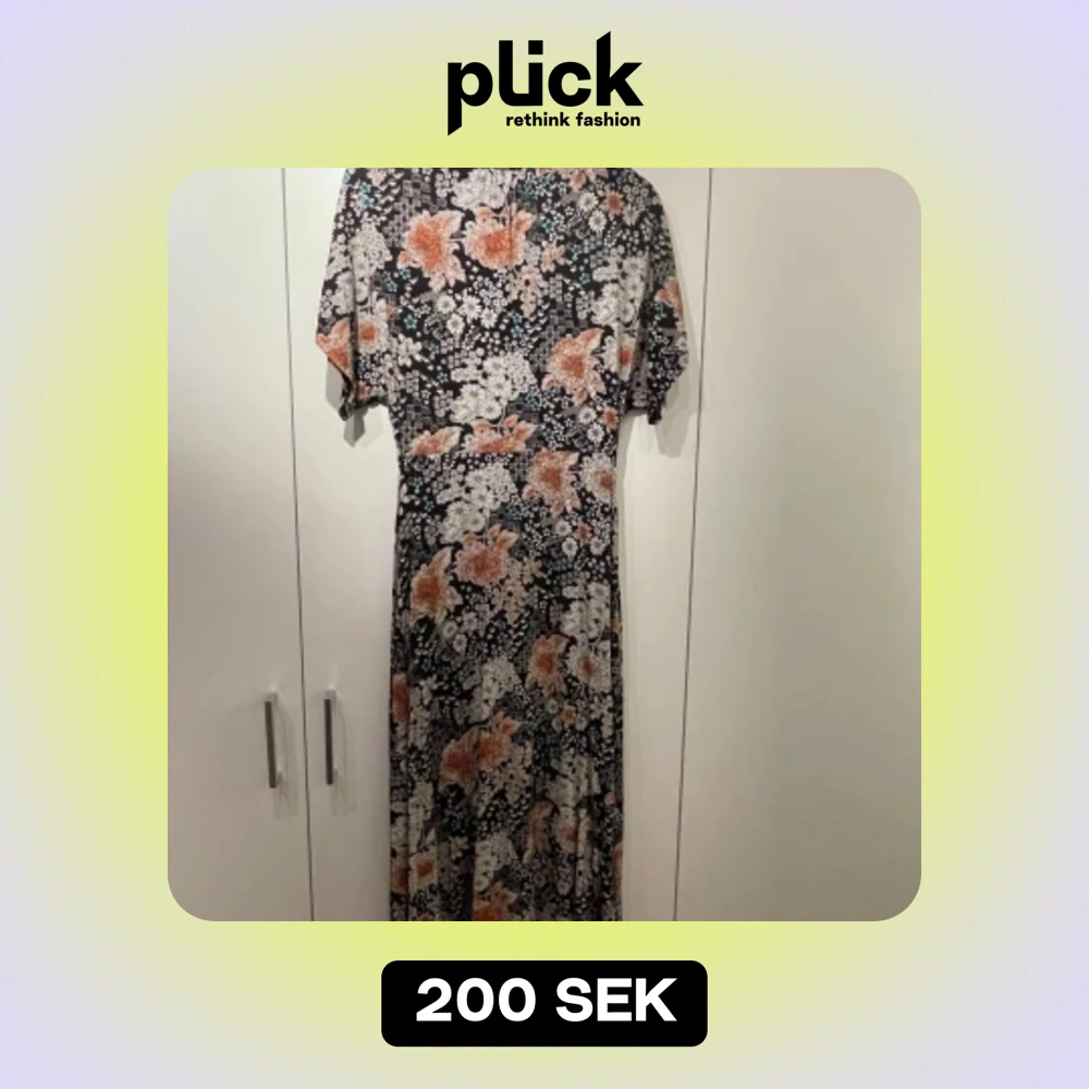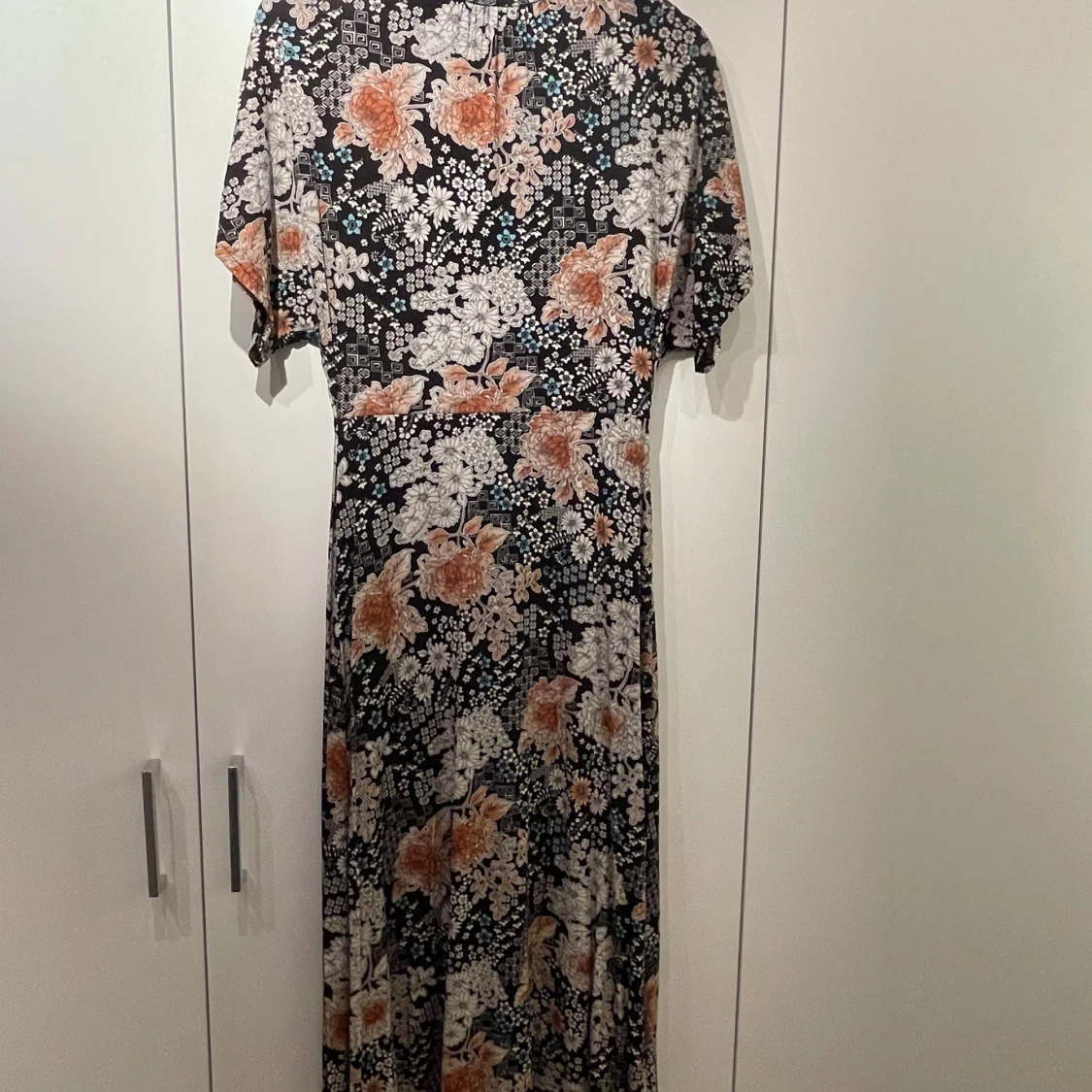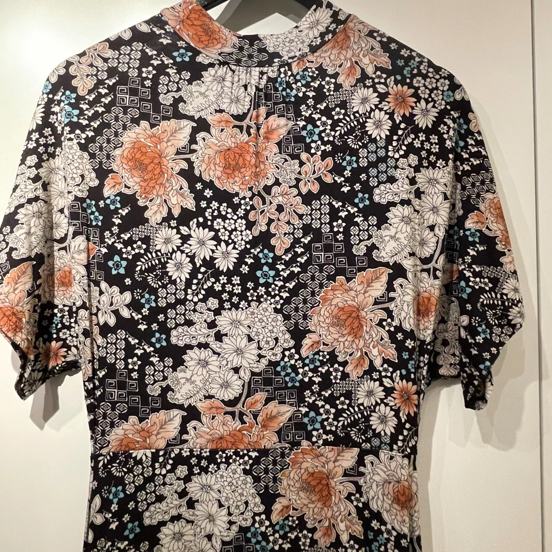 Snygg klänning i viskos/bomull hög hals, snygg knäppning baktill. Markerande midja, längd strax under knä.