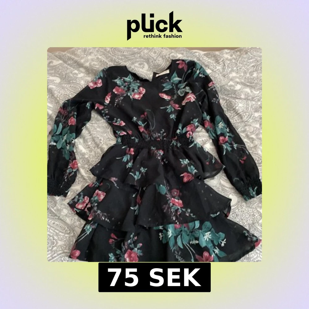 Säljer en söt blommig klänning från Ü med volanger och långärmad design. Klänningen har en elastisk midja och ett vackert blommönster i rosa och grönt på en svart bakgrund. Perfekt för en stilfull look!