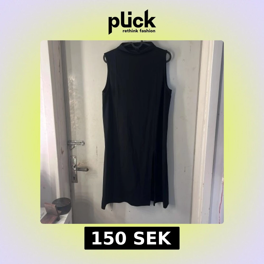 Säljer en svart ärmlös klänning med hög hals och slits framtill. Klänningen har en rak och enkel design som ger en stilren look. Perfekt för dig som gillar minimalistiskt mode.