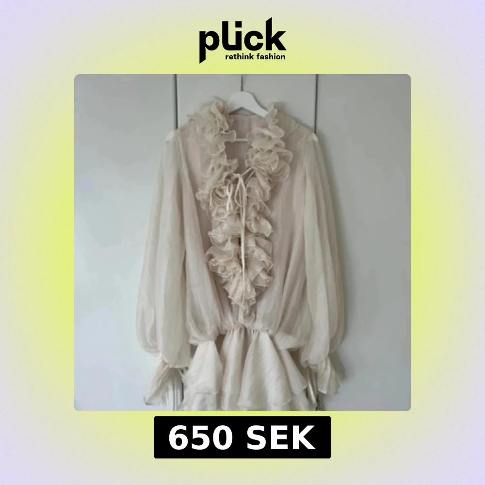 Superfin kort klänning med volanger längs halsringningen och framtill. Långa, luftiga ärmar och omlottkänsla vid kjolen. Den är precis lagom lång och perfekt för dig som gillar unika detaljer. Har tyvärr inte kommit till användning. Ny pris 1000 kronor. 💕