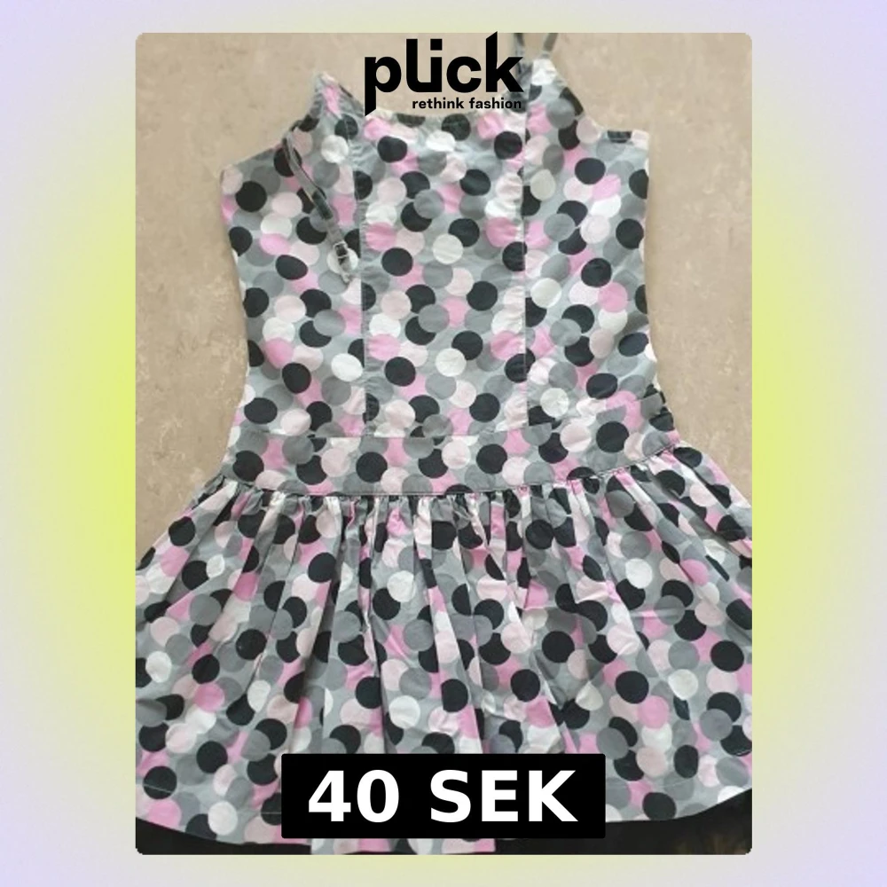 Söt klänning med smala axelband och volangkjol. Mönstret är prickigt i svart, vit, grå och ljusrosa. Klänningen har en smockad rygg för extra komfort och en lekfull look. Perfekt för dig som gillar färg och mönster! Ena axelbandet har gått av.