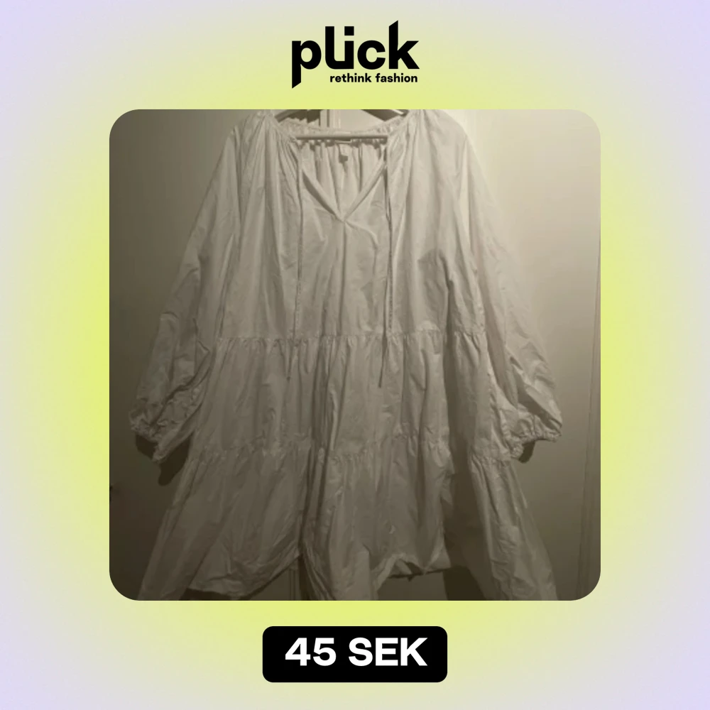 Vit klänning med lös passform. Skönt och luftigt bomullstyg. Går ungefär till mitten av låren på mig som är 165 cm. Endast provad men tyvärr aldrig använd.
