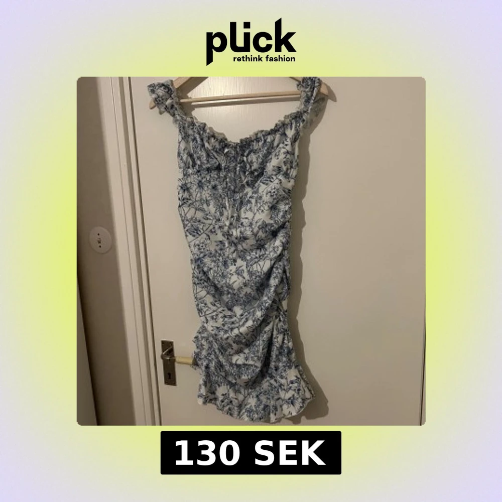 blommig klänning i vitt och blått med volangdetaljer. Klänningen har en smickrande passform och är perfekt för varma dagar. Den är ärmlös med breda axelband och har en lätt rynkad effekt vid bysten.