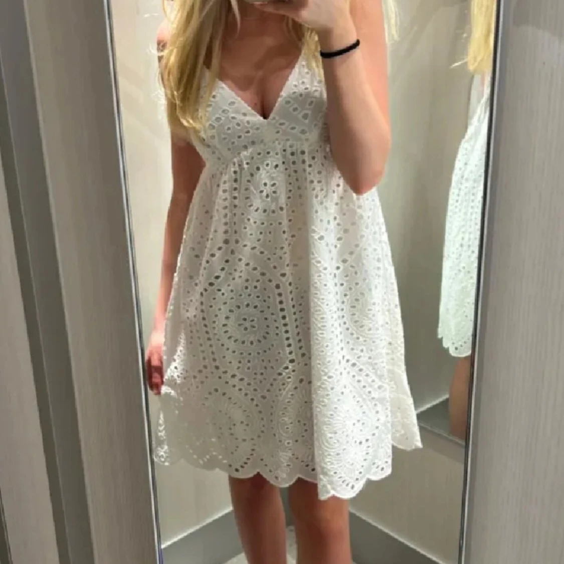 säljer mitt jättegulliga vita klänning, använd 1 gång, perfekt längd, knytning därbak så lite av ryggen syns och man kan göra midjan tajtare.🤍