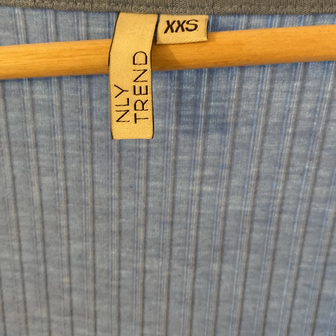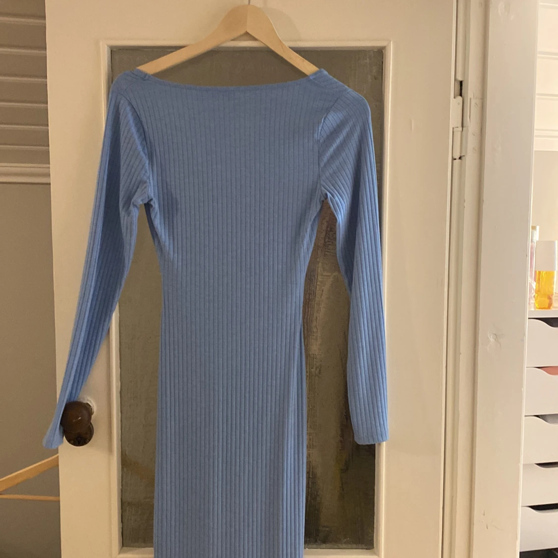 En blå ribbad klänning från NLY Trend med långärmad design och v-ringad hals. Klänningen är i storlek XXS och har en tight passform som formar kroppen på ett sjukt fint sätt🥰
