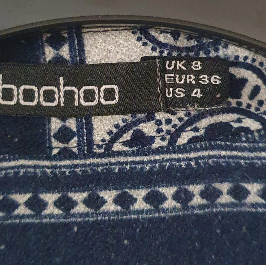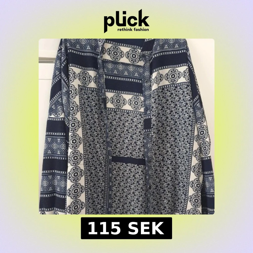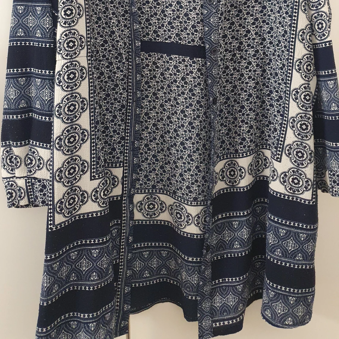 Säljer en snygg blåvit klänning från Boohoo med unikt mönster i olika geometriska och blommiga former. Klänningen har långa ärmar och en lös passform, perfekt för dig som gillar bohemisk stil. Mjuk och skön mot huden. Lite nopprig
