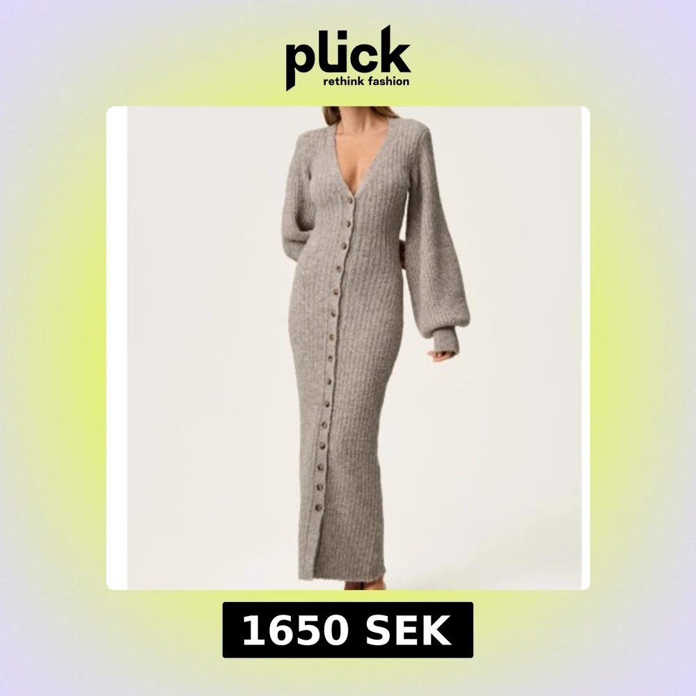 Beige långklänning i stickat material med v-ringning och knappar framtill. Använd vid ett tillfälle.