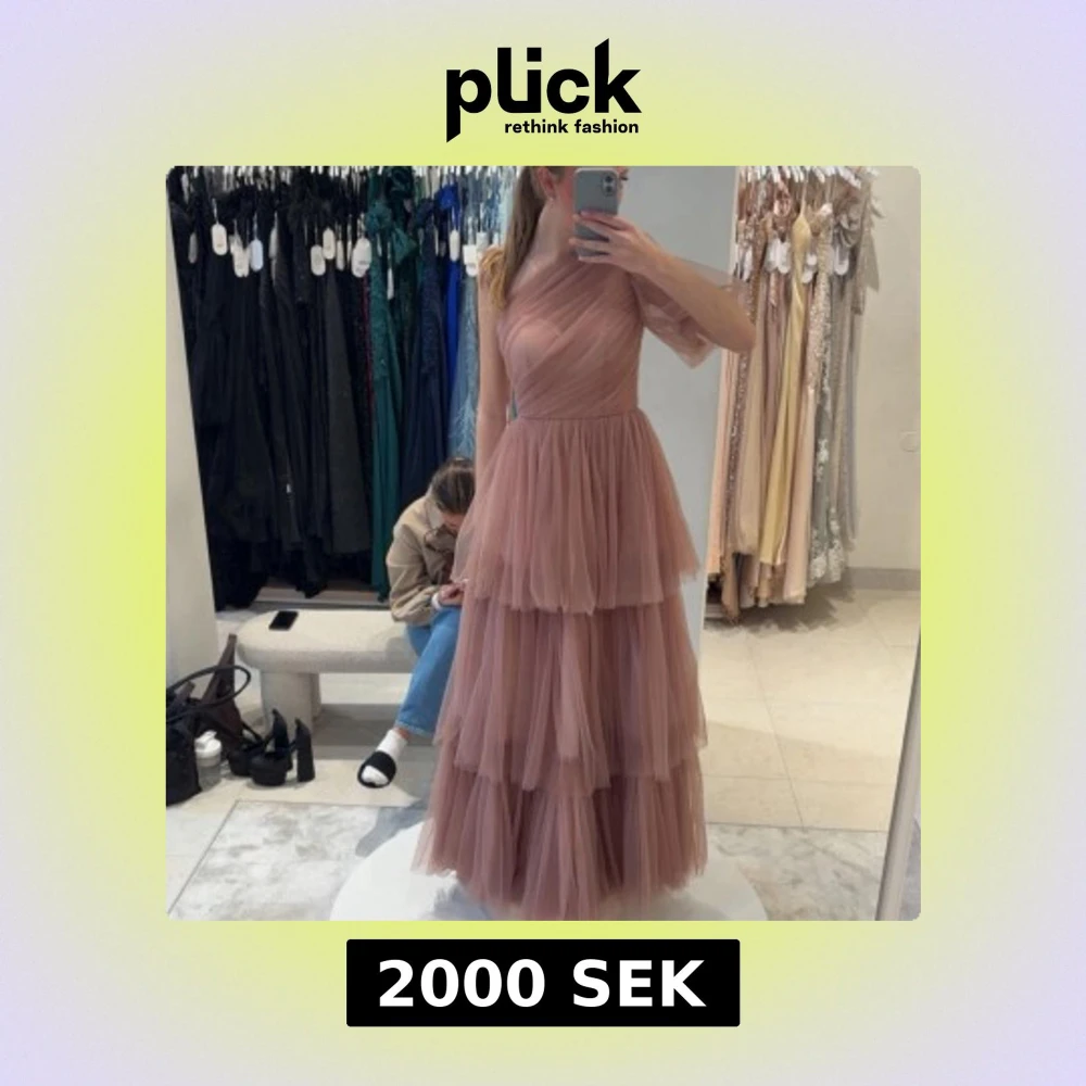 Romantisk långklänning i rosa tyll med flera lager och oneshoulder-design. Klänningen har volanger och markerad midja, perfekt för speciella tillfällen. Den luftiga tyllen ger en drömmig känsla och den asymmetriska axeln gör looken unik.