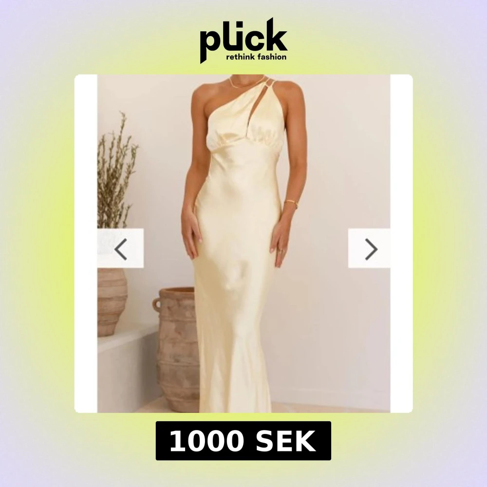 Elegant ljusgul långklänning i siden med en stilren oneshoulder-design. Köpt på hemsidan Bille J! På hemsidan kostar den 841kr men med tull 1300kr då den kommer från Australien. Säljer den pågrund av inte min stil!🩷klänningen finns inte kvar på hemsidan längre!🩷Prislapp sitter kvar!