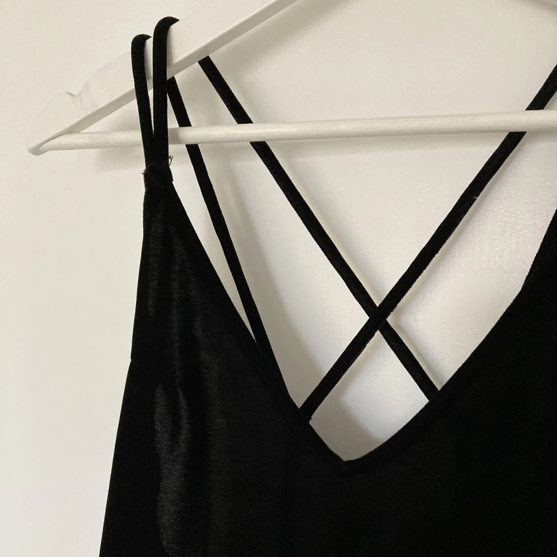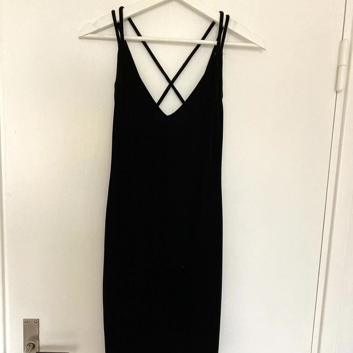 Supersnygg svart sammetsklänning som är öppen i ryggen och helt oanvänd! Klänningen är v-ringad framtill och sträcker sig till strax ovanför knäna ungefär. Köpt på BikBok i storlek S, nypris 700kr.