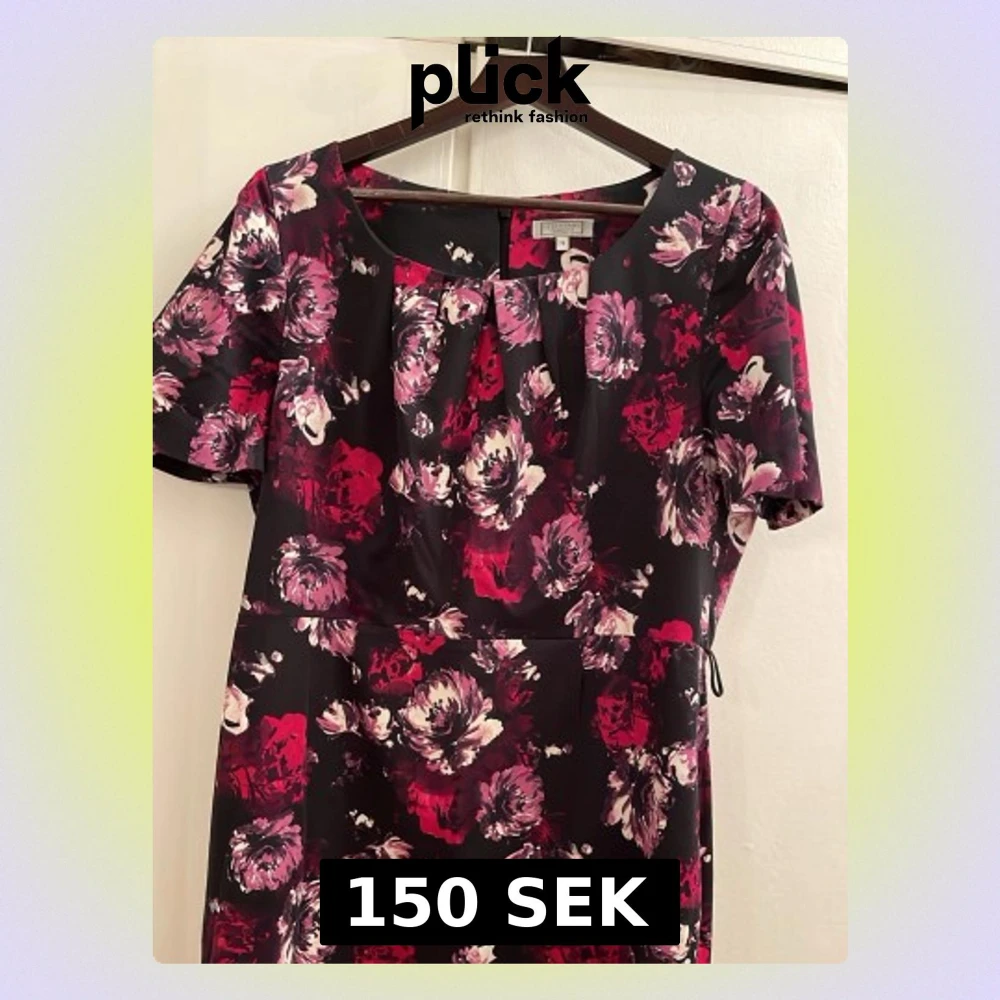 Snygg blommig klänning från Debenhams med korta ärmar och rundad halsringning. Klänningen har ett mönster i rosa, rött och vitt på svart botten och är figurnära med veckad detalj vid halsen. Perfekt för dig som vill sticka ut med färg och mönster.