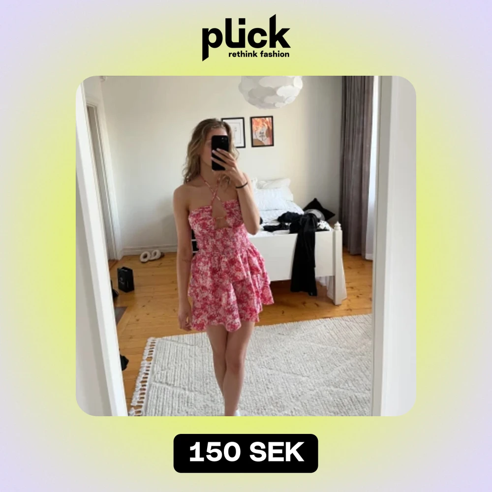 Rosa/röd blommig klänning som är oanvänd. Man kan knyta banden vid halsen på olika sett (se första och andra bilden)
