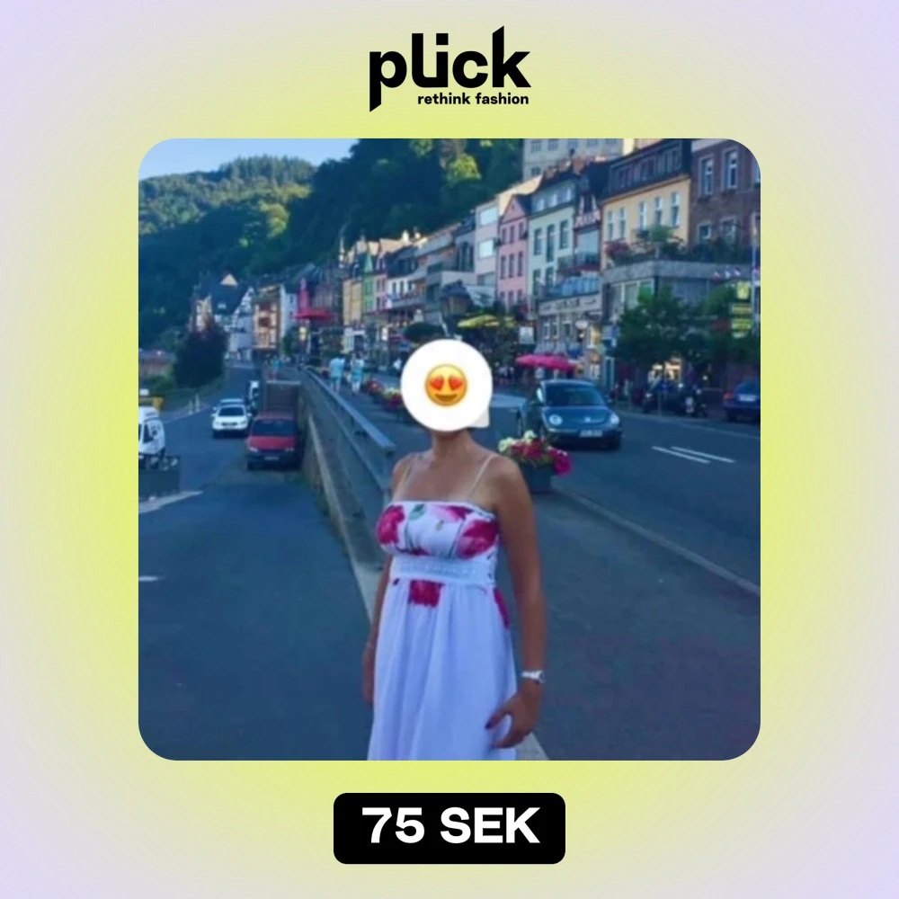 klänning med stora rosa blommor Mycket skönt för sommaren , den är som att bära moln på sig! ( lite genomskinlig, med en underkjol syns ingenting 😊) Fin detalj i midjan och knyttband baksidan. Storlek: det står one-size men jag skulle säga 36-40