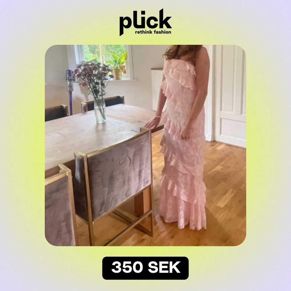 Jättefin ljusrosa volangklänning Jätte fin och använd 1 gång Säljer då den är väldigt tajt vid brösten på mig Kan användas både som balklänning eller bara en fin sommarklänning