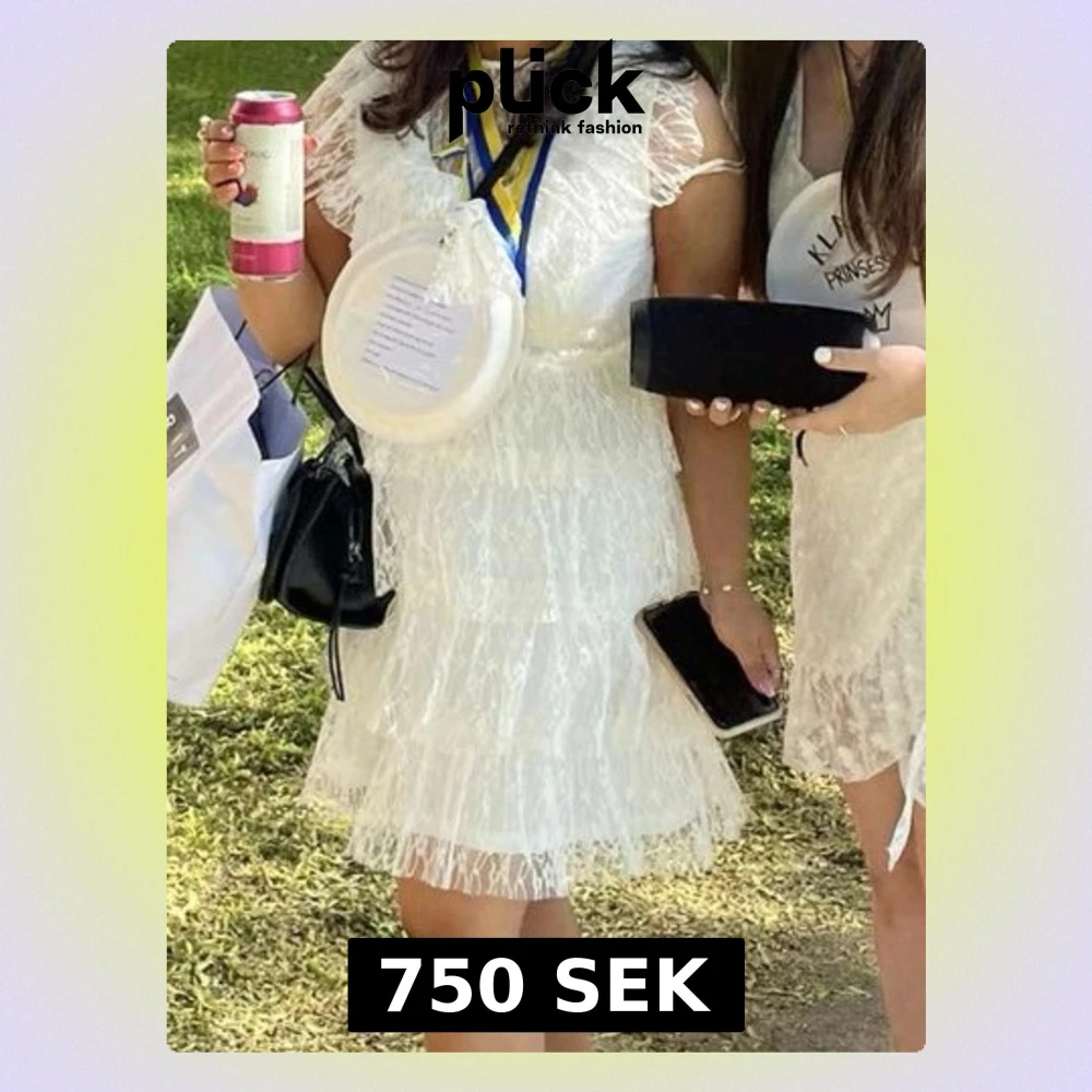 Söt vit kortklänning i spets med volangdetaljer och transparenta ärmar. Klänningen har en rund halsringning och är figurnära upptill med ett lätt utställd kjol. Perfekt för student eller sommarens tillfällen.