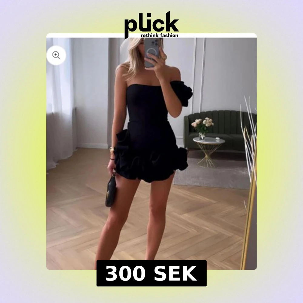 Supersnygg svart kort klänning med volangdetaljer och axelbandslös design. En axel har en extra volang för en cool asymmetrisk look. Perfekt för dig som vill sticka ut med en trendig och elegant stil. Storlek M har ej använt. Passar inte mig trodde den va liten i storlek.