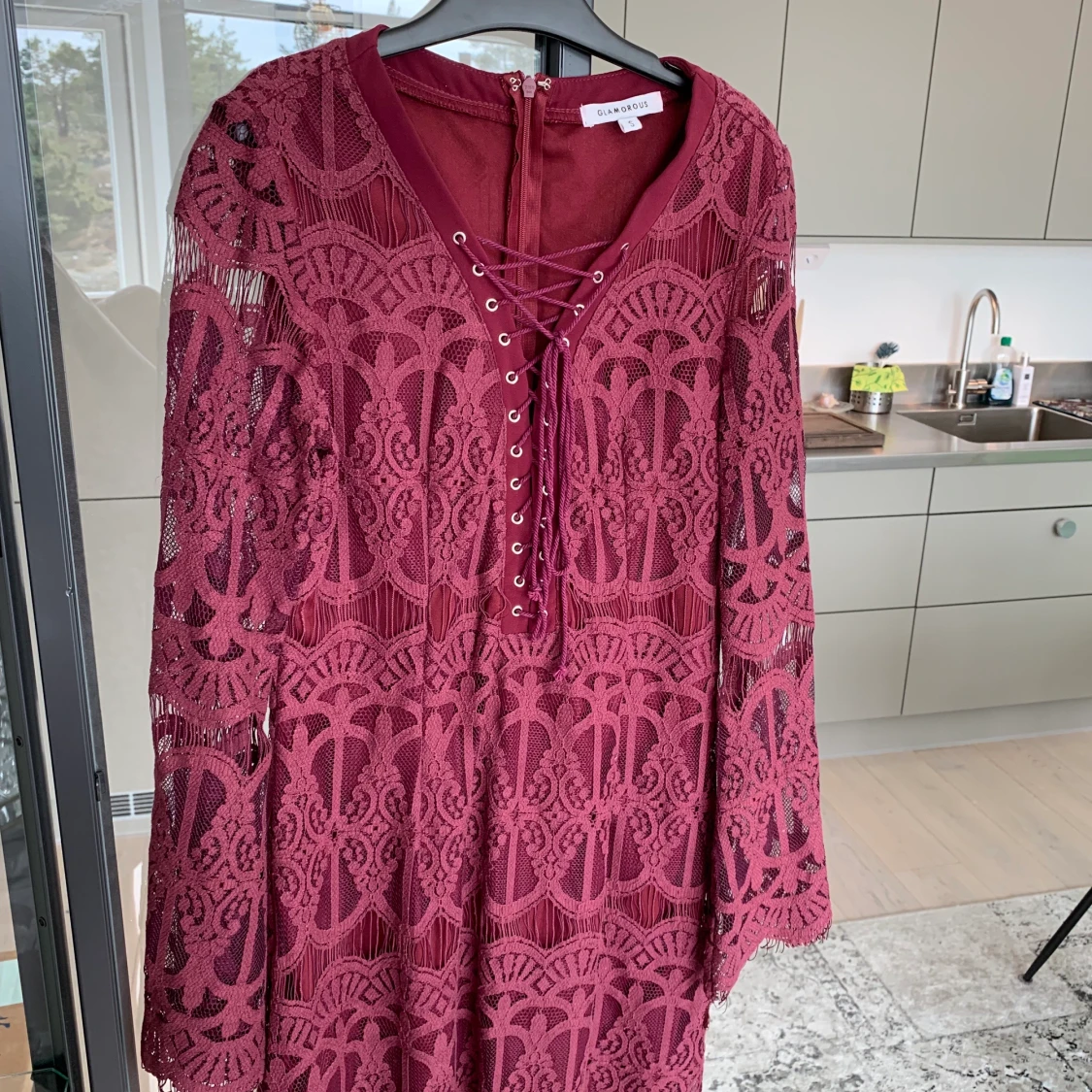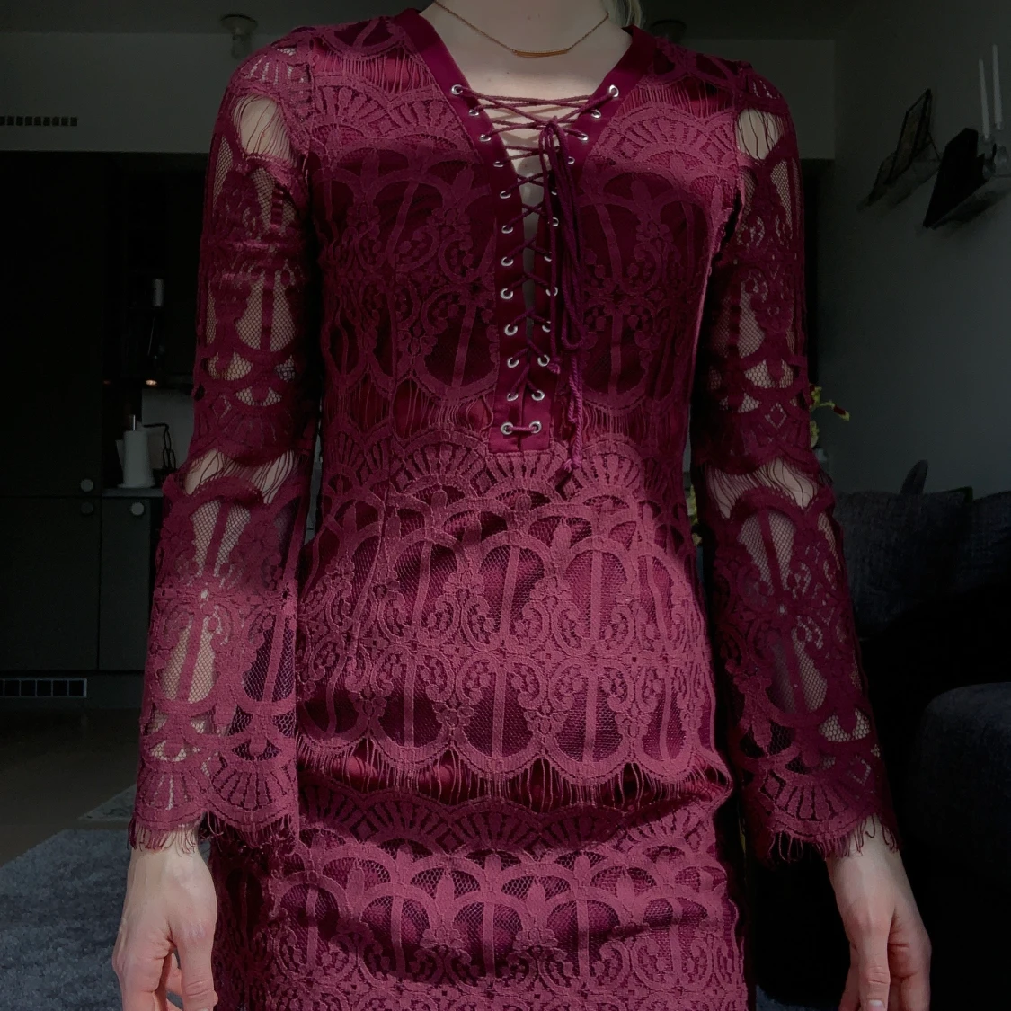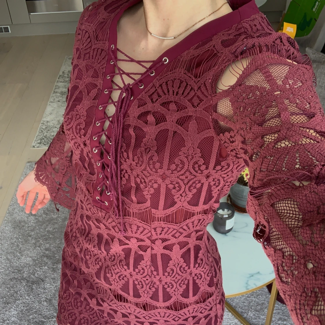 Sparsamt använd klänning i spets med utsvängda armar. Superfin vinröd färg. Storlek S och passar troligtvis person mellan 160-170. Jag är 165 och passar mig utmärkt i längden. Varken stor eller liten i storlek, en ”vanlig” S.