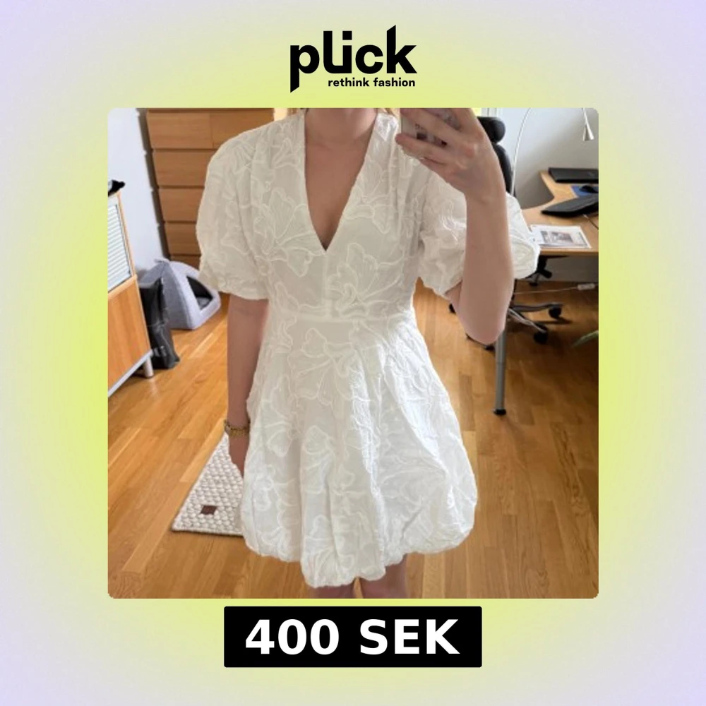 Helt ny superfin vit klänning med puffiga korta ärmar och v-ringning. Klänningen har ett broderat blommigt mönster och ballongformad kjol. Perfekt för sommarens tillfällen och student. Säljs då jag beställde två olika storlekar och den här är för stor. Klänningen är i storlek S.