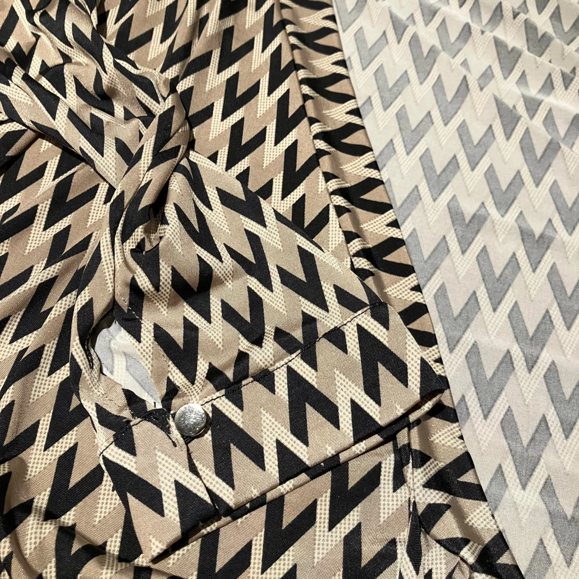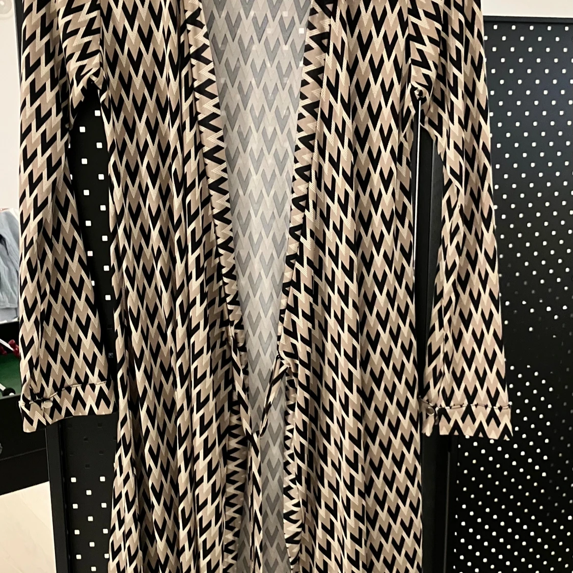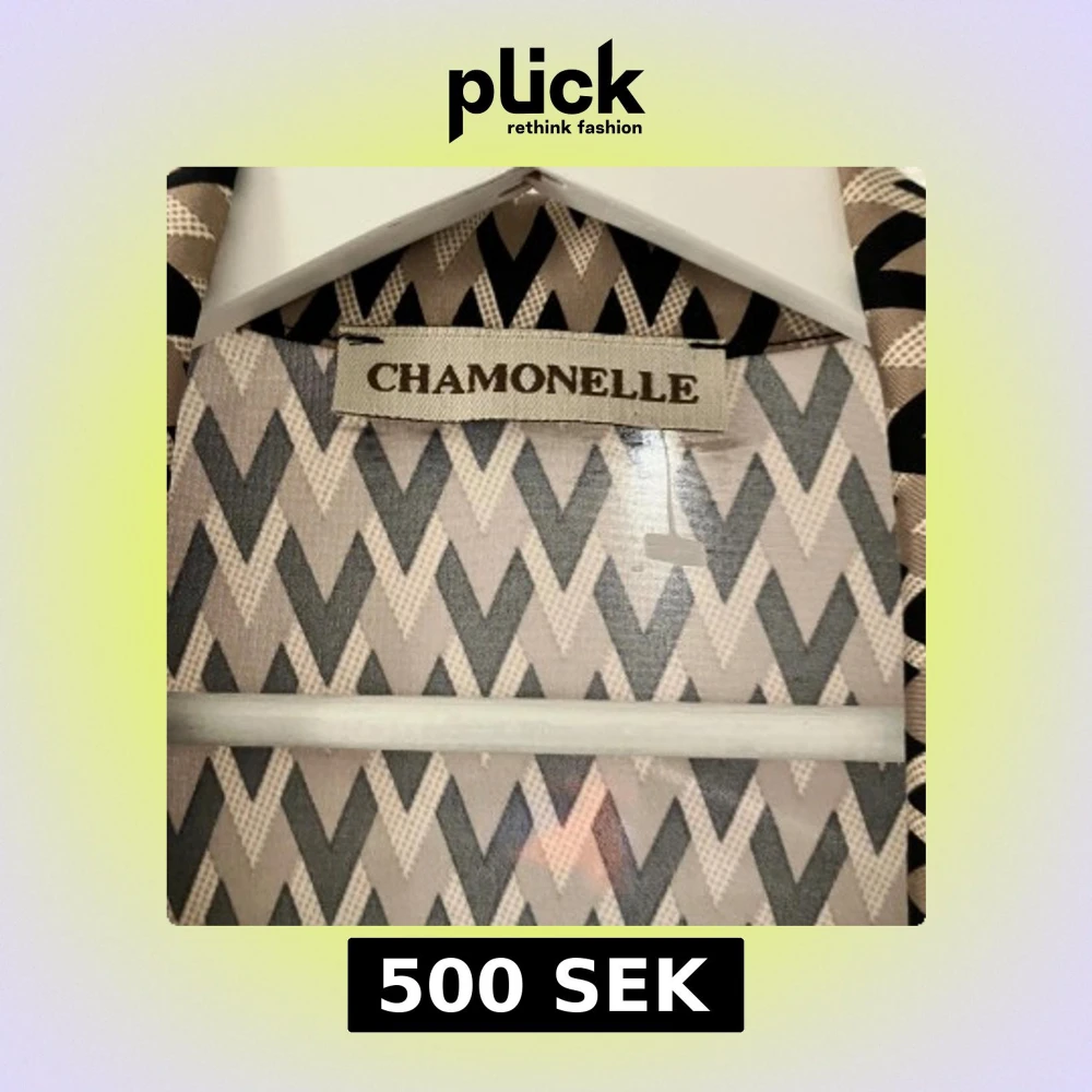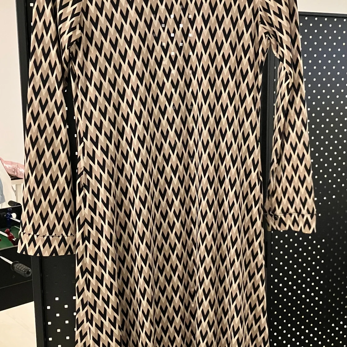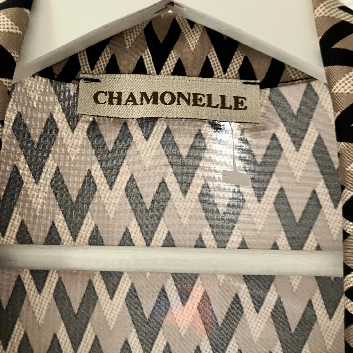 Snygg klänning från Chamonelle med coolt zigzag-mönster i beige och svart. Klänningen är gjord i ett mjukt, glansigt material som känns skönt mot huden. Perfekt för dig som gillar att sticka ut med grafiska prints.